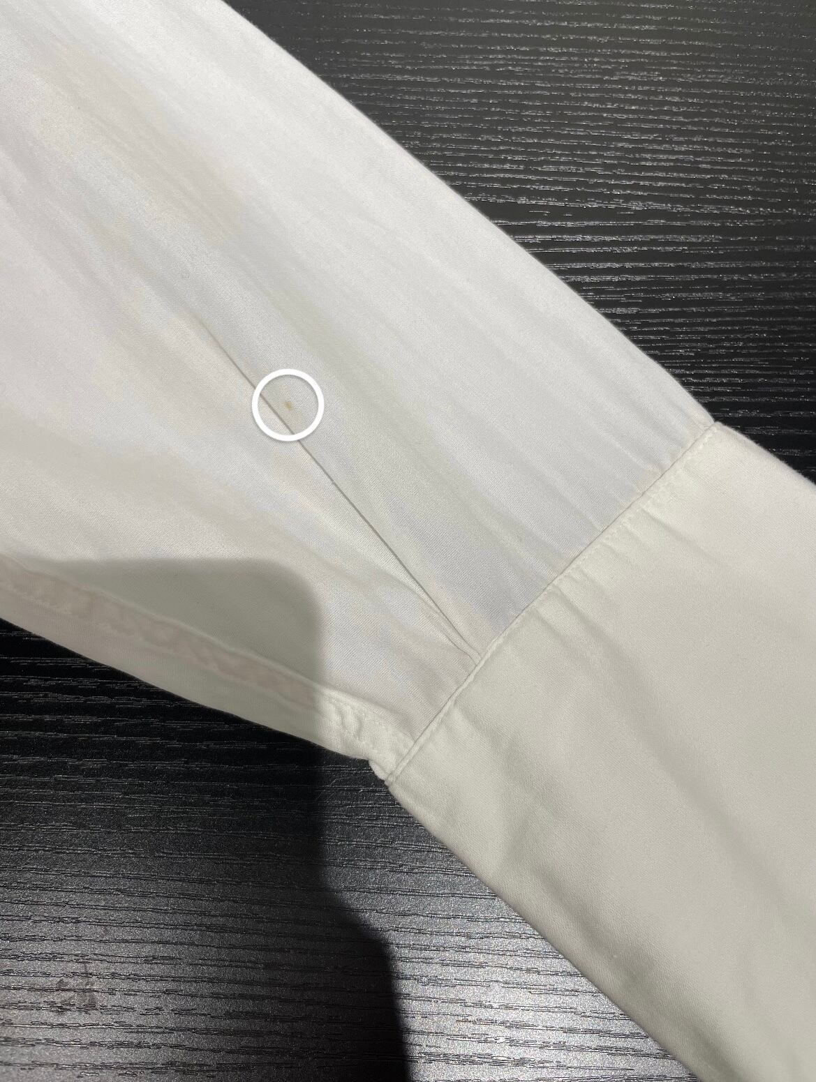 左袖中央部と下部、後身頃両肩にシミがございます。添付写真をご参照ください。
