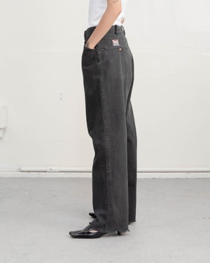 フロント右足首付近と後ろ太もも付近にシミ、前膝付近と後ろ右裾にリペア跡がございます。添付写真をご参照ください。