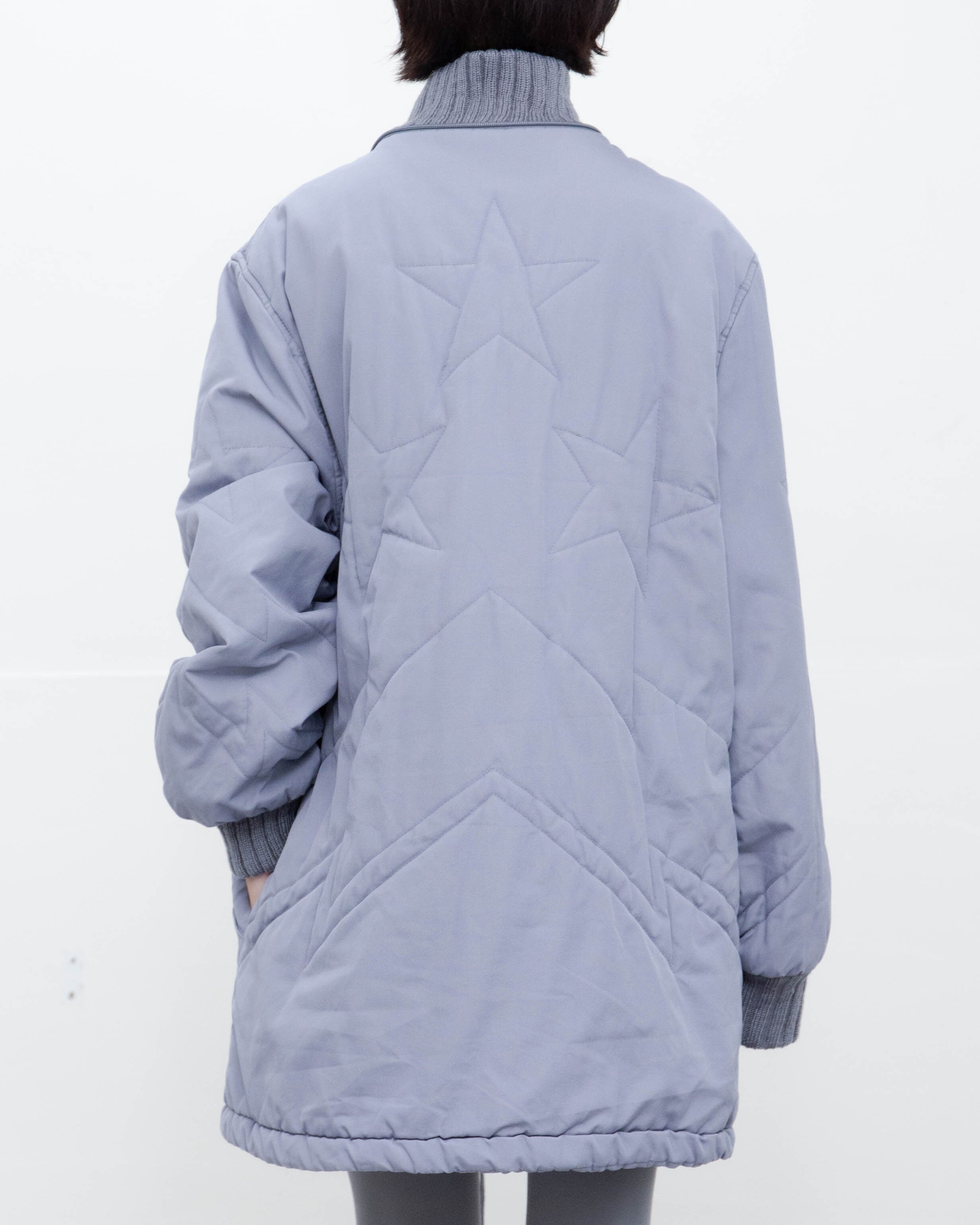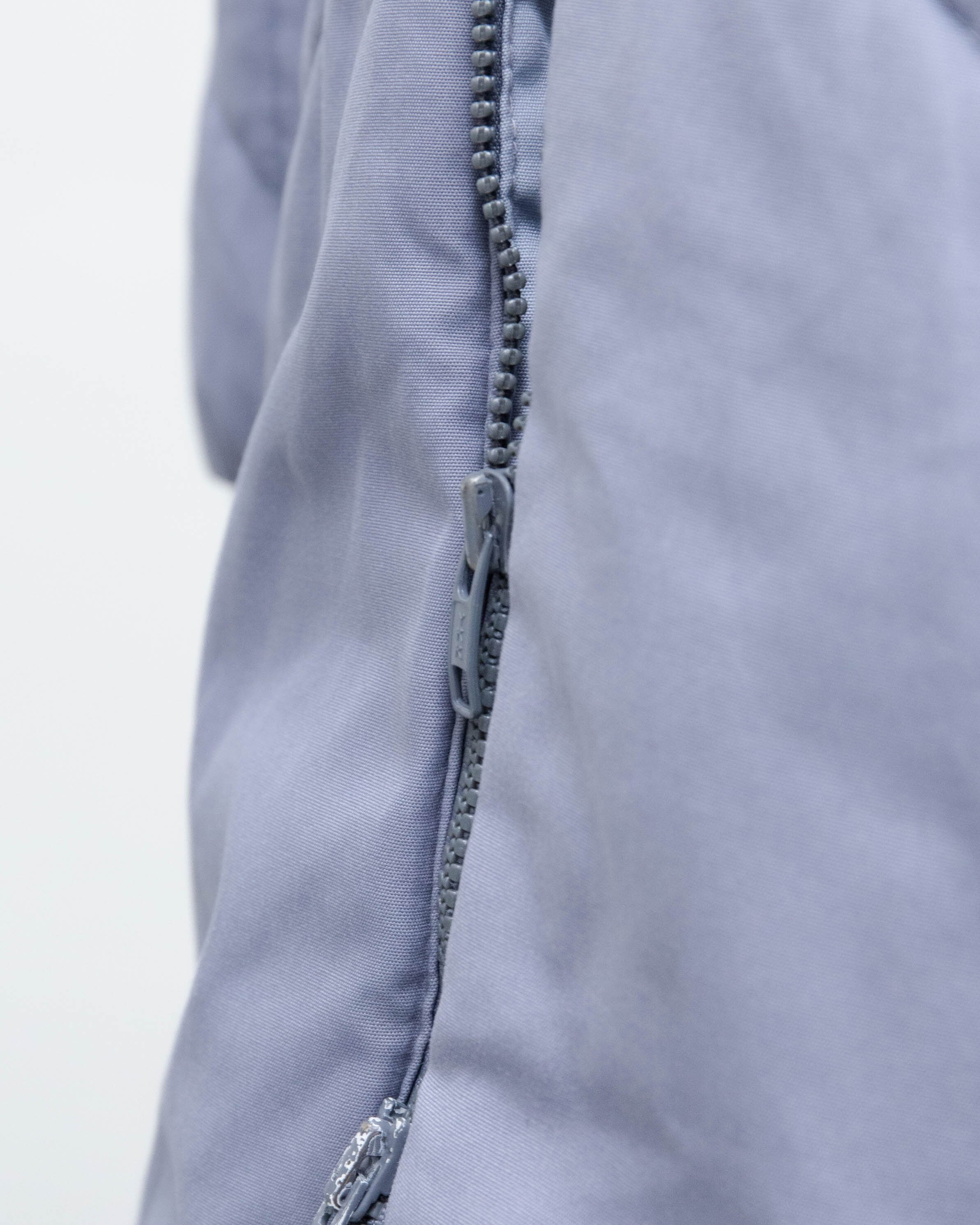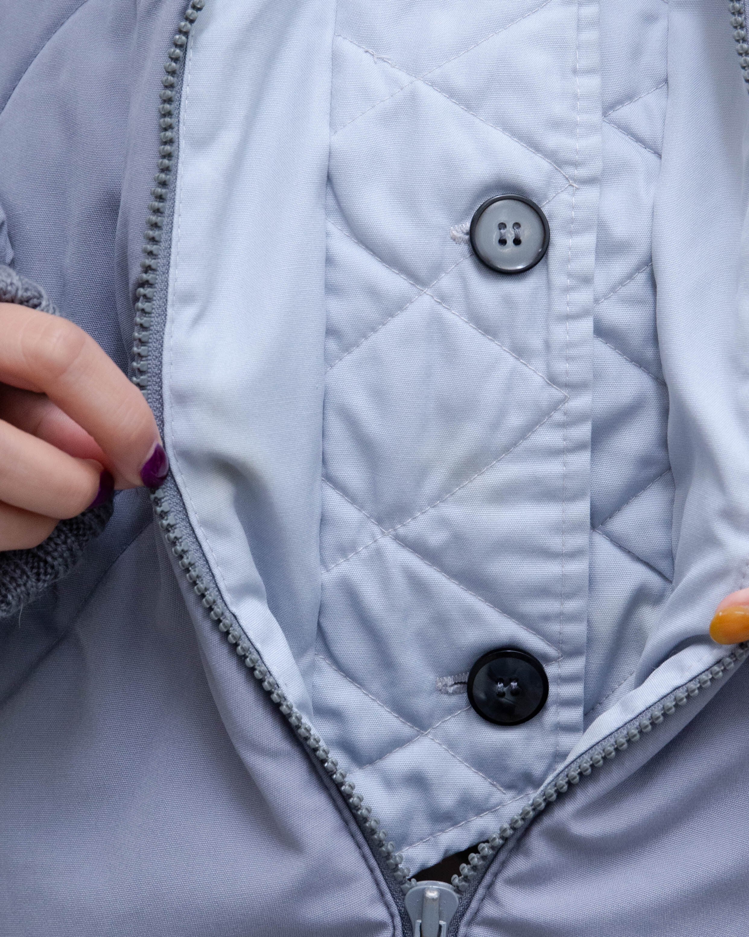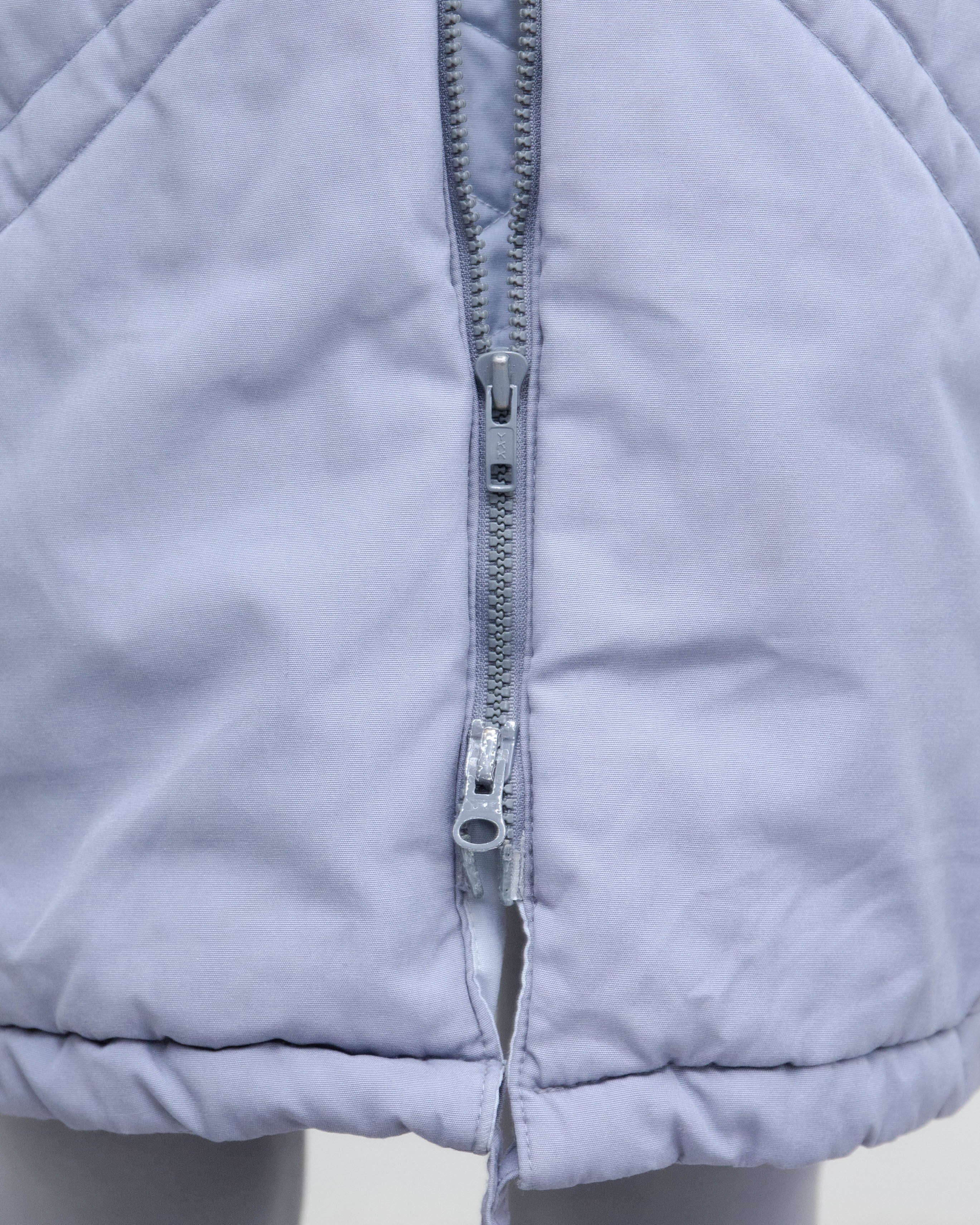ジップ上金具の変形、前身頃右胸部付近と腹部、右袖下部、ジップ下裏地下部にシミがございます。添付写真をご参照ください。