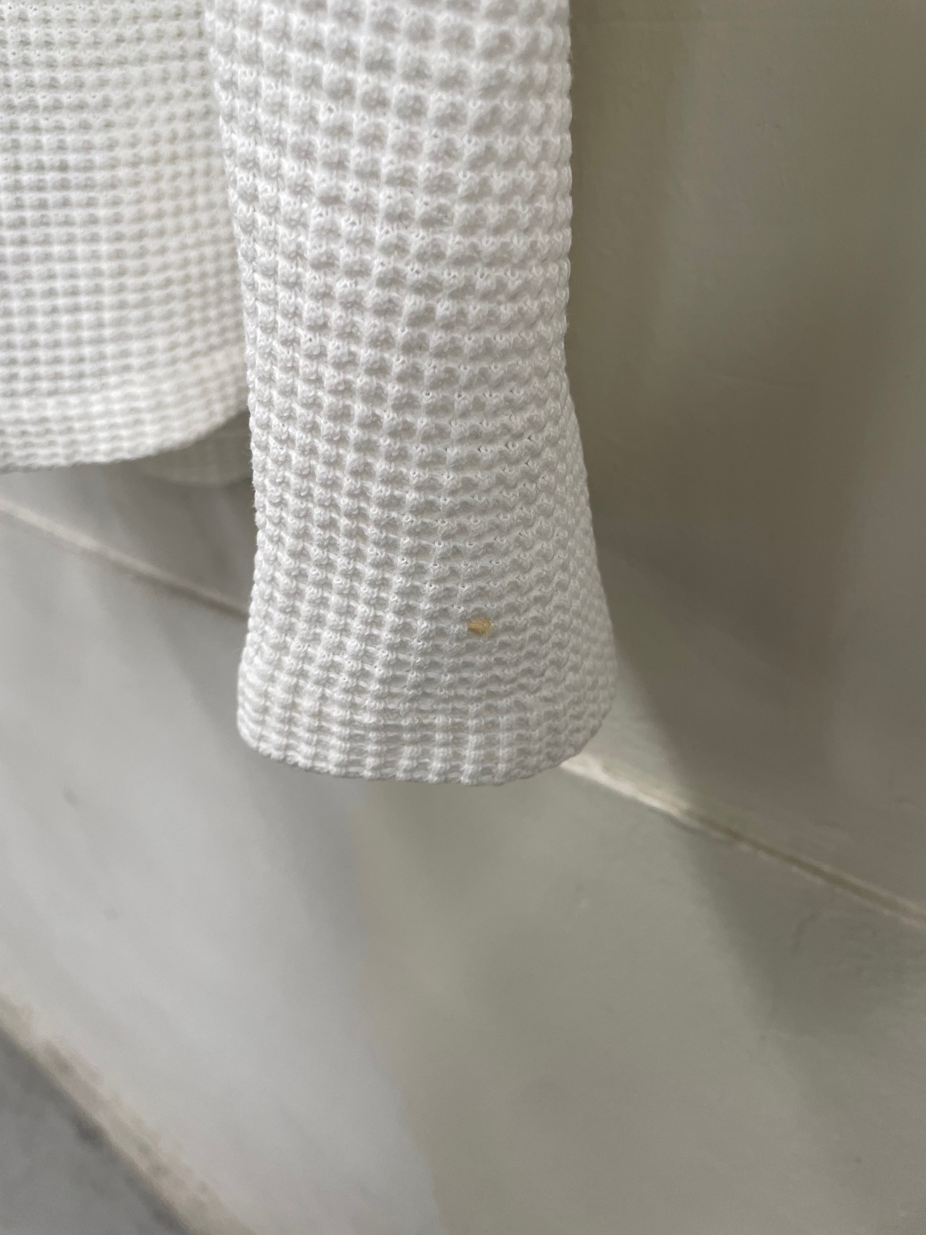 左横腹裾にシミ、右袖口に穴がございます。添付写真をご参照ください。