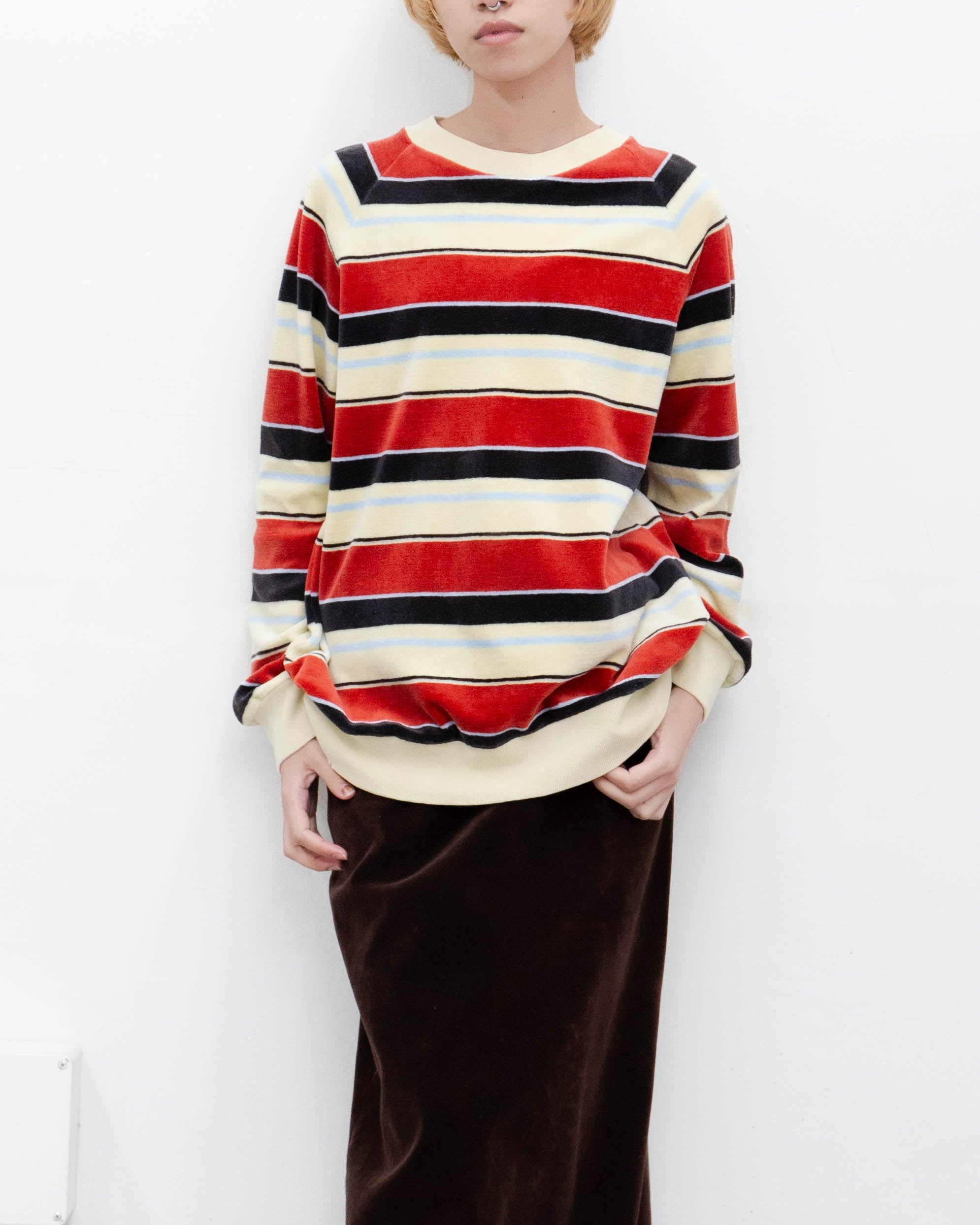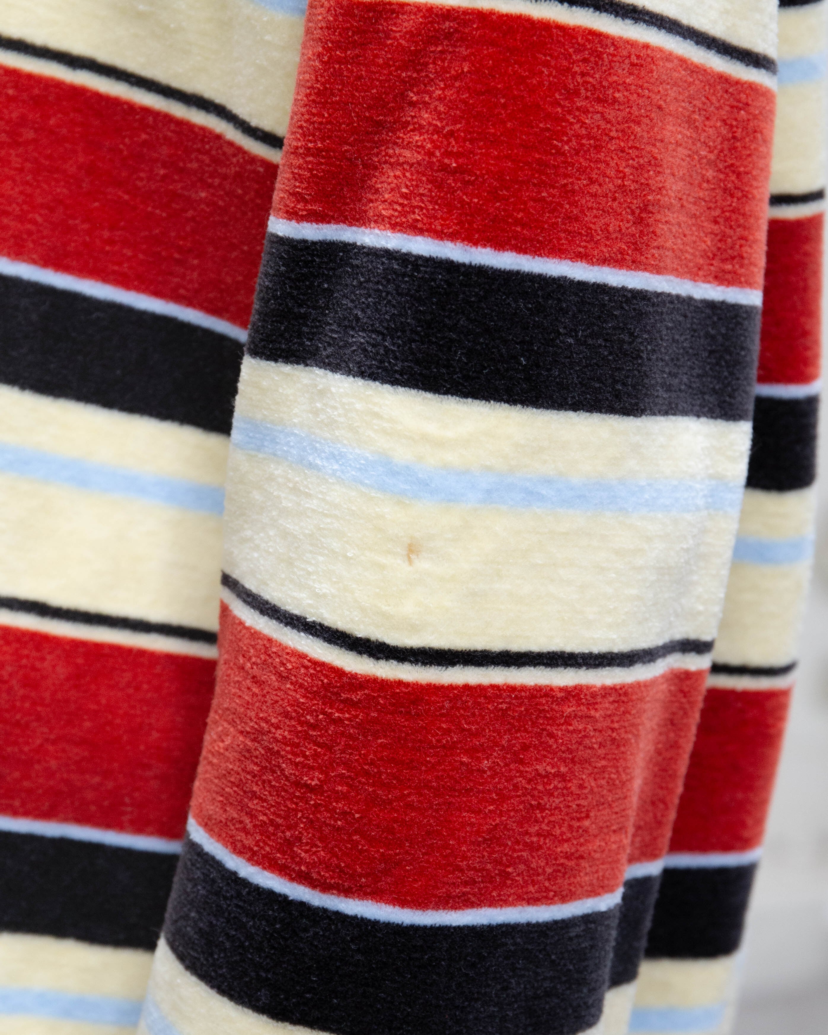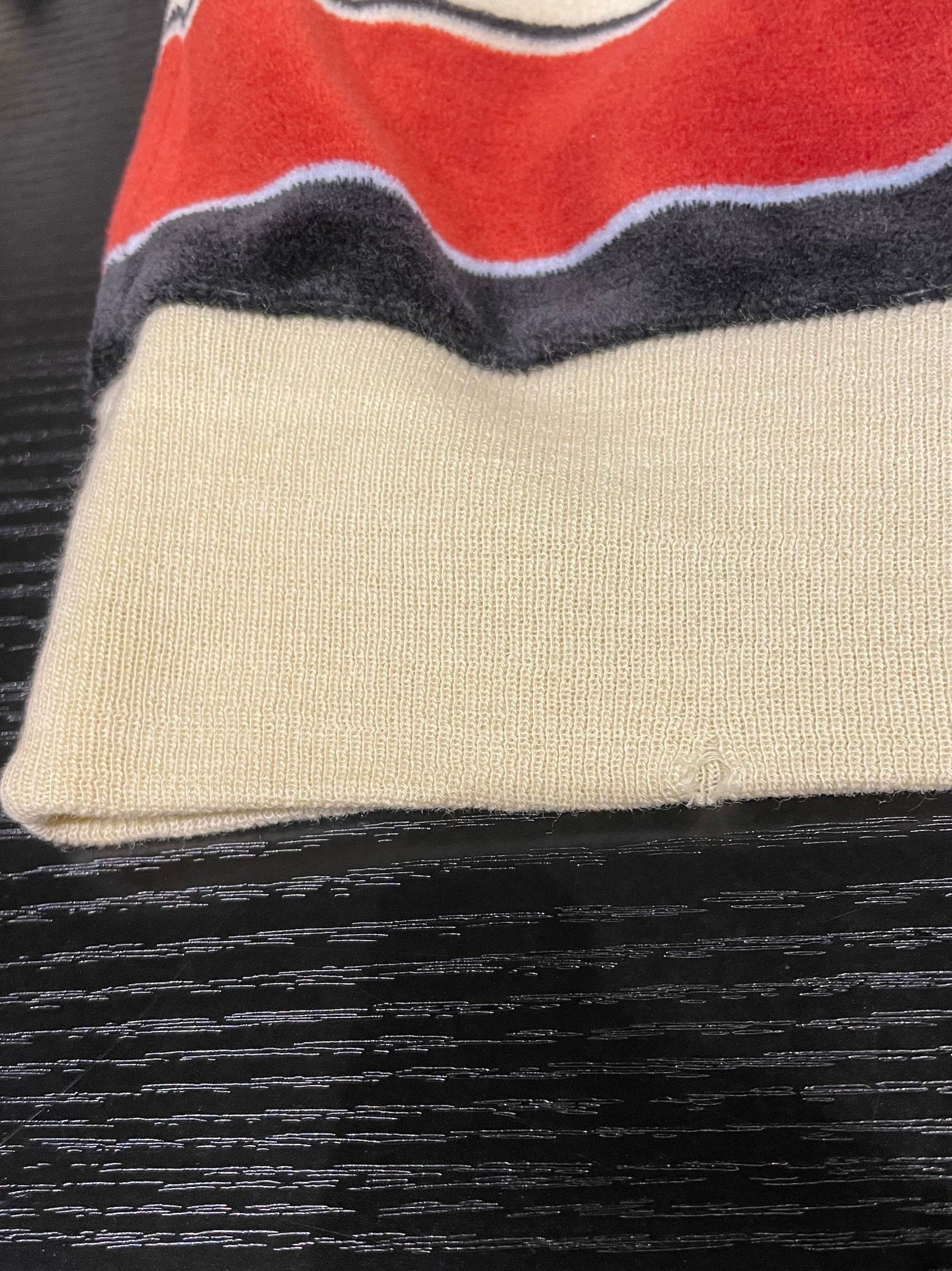 左袖中央と前身頃左裾にシミ、前身頃右裾に小穴がございます。添付写真をご参照ください。