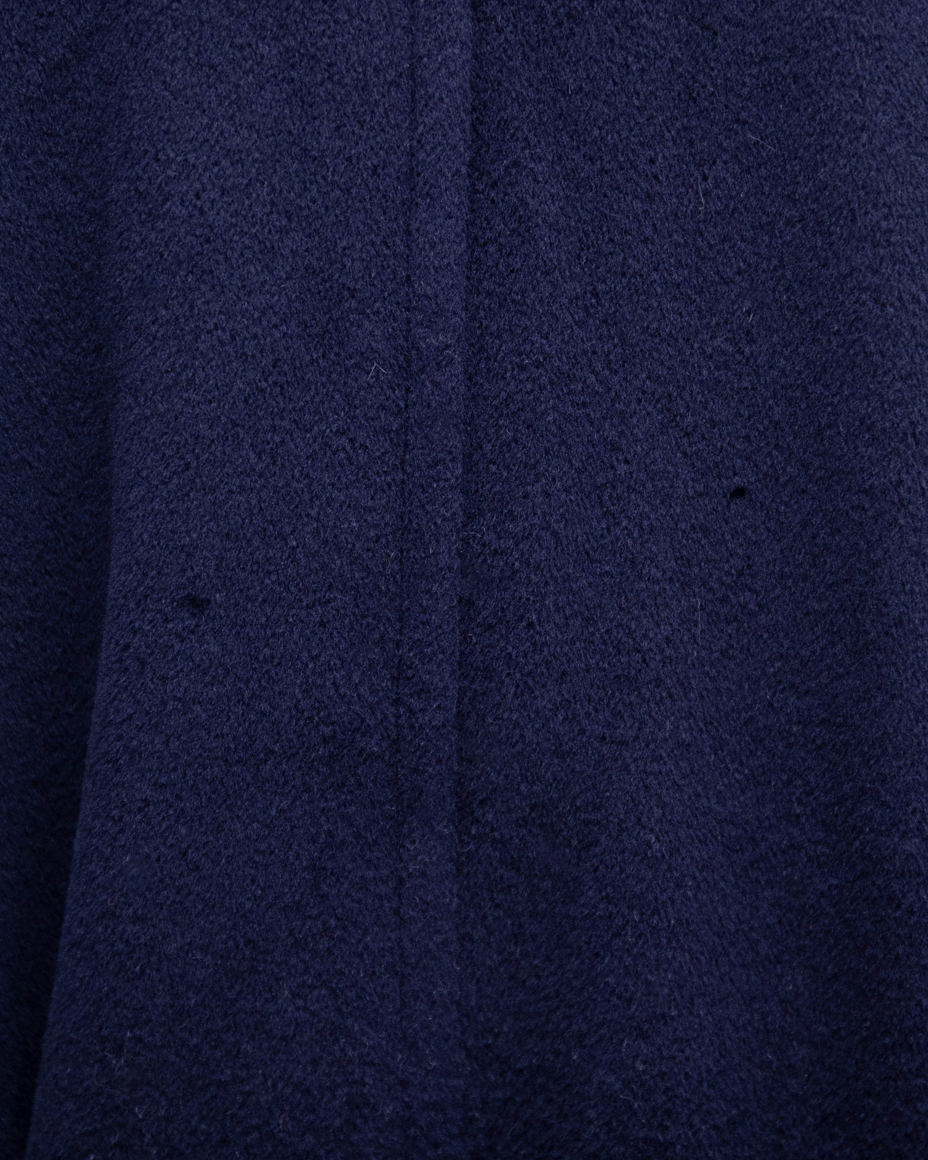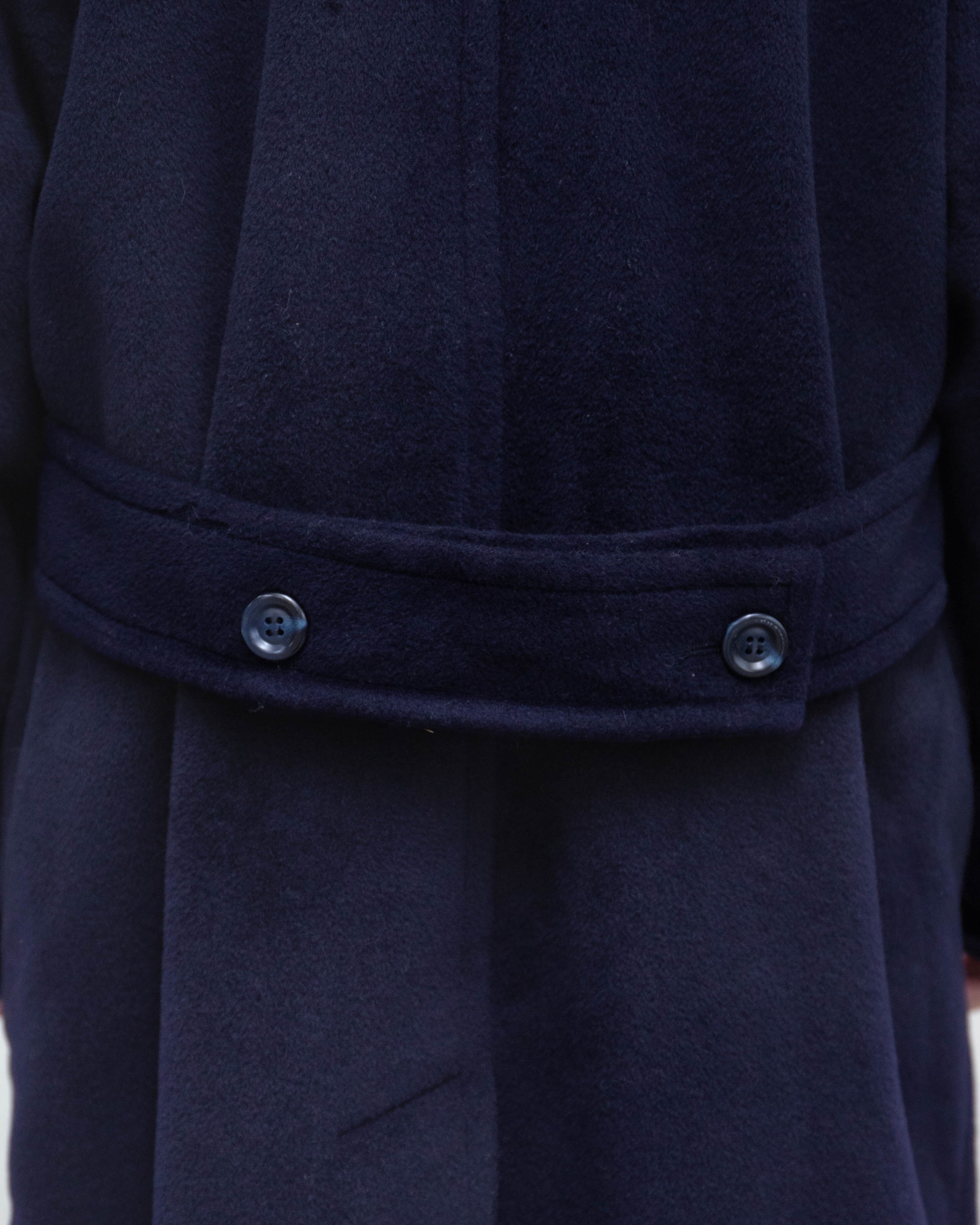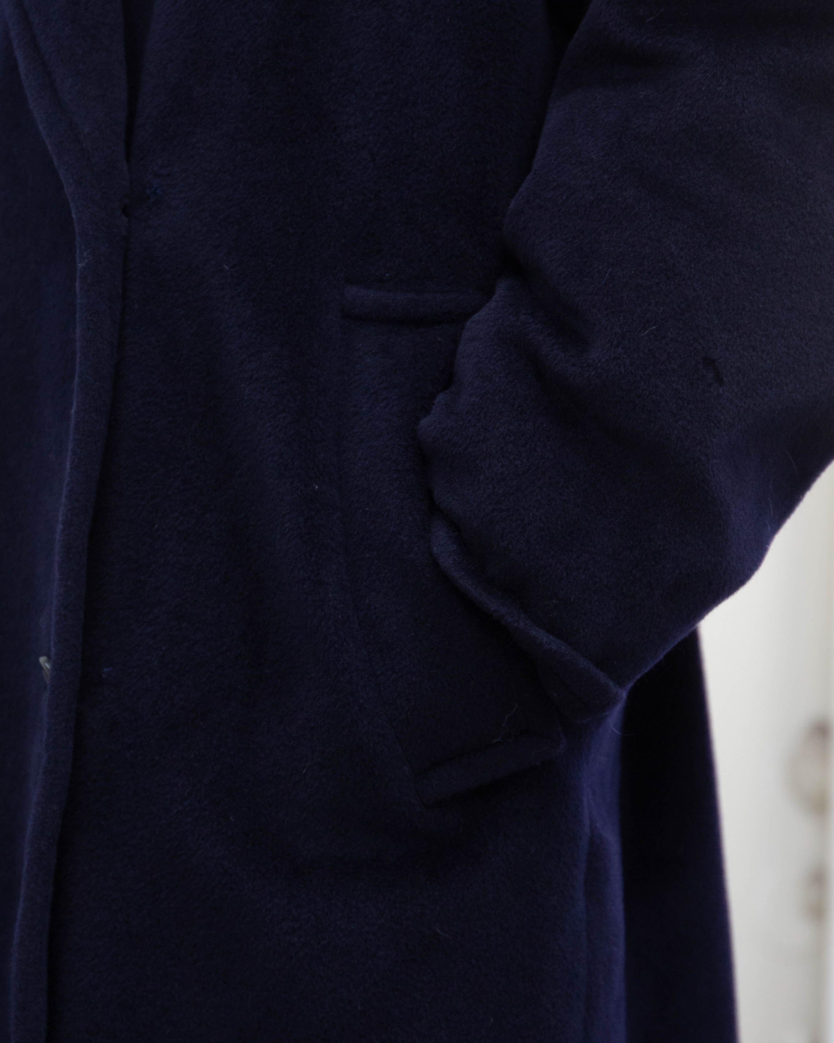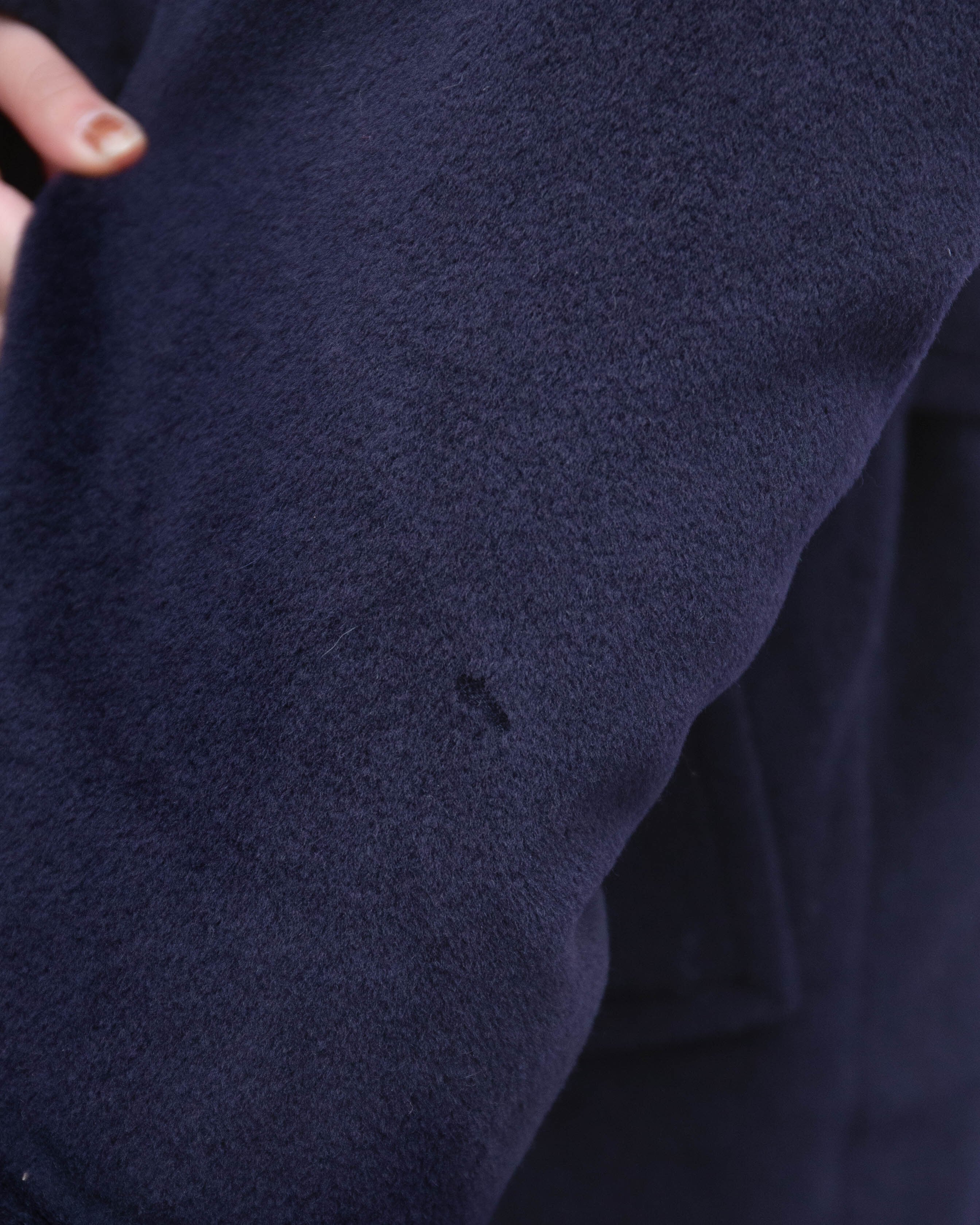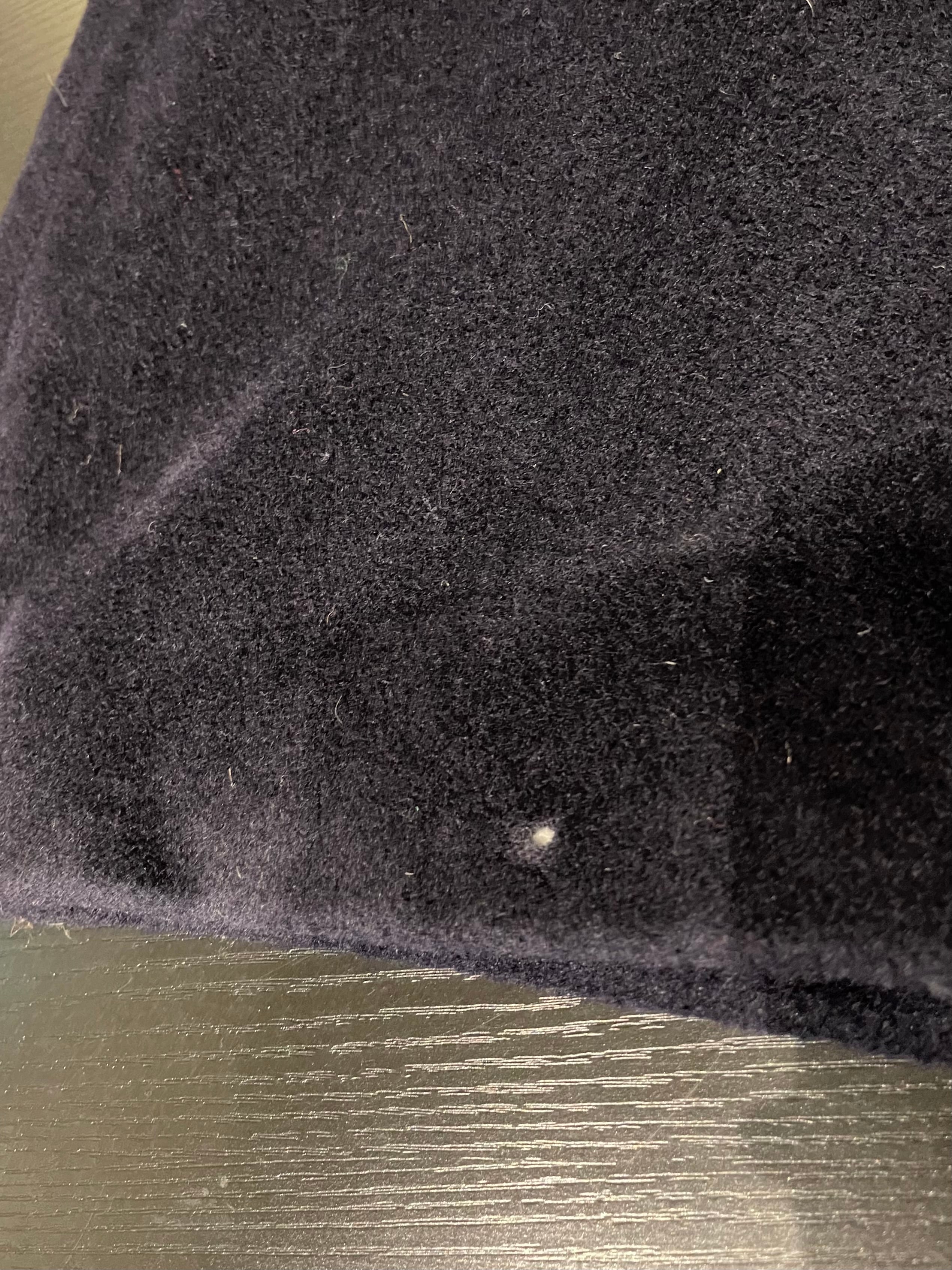 前襟、左袖上部と下部、後身頃中央に毛抜け、前身頃右裾、後左袖上部に穴がございます。添付写真をご参照ください。