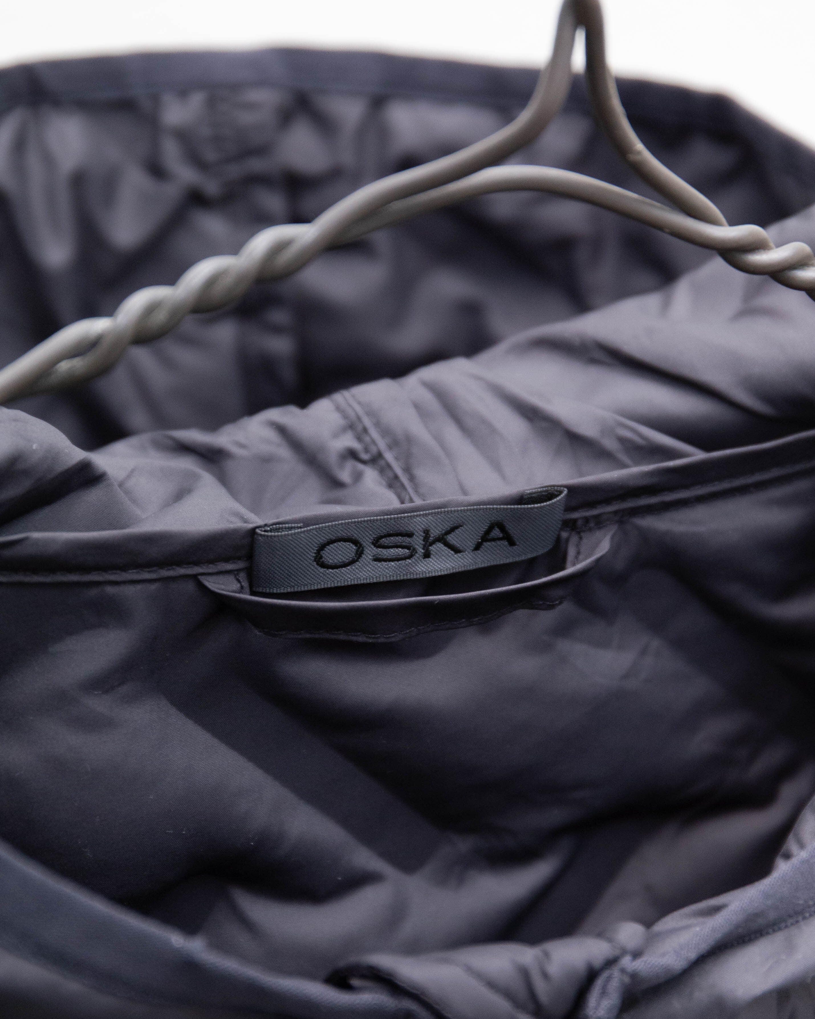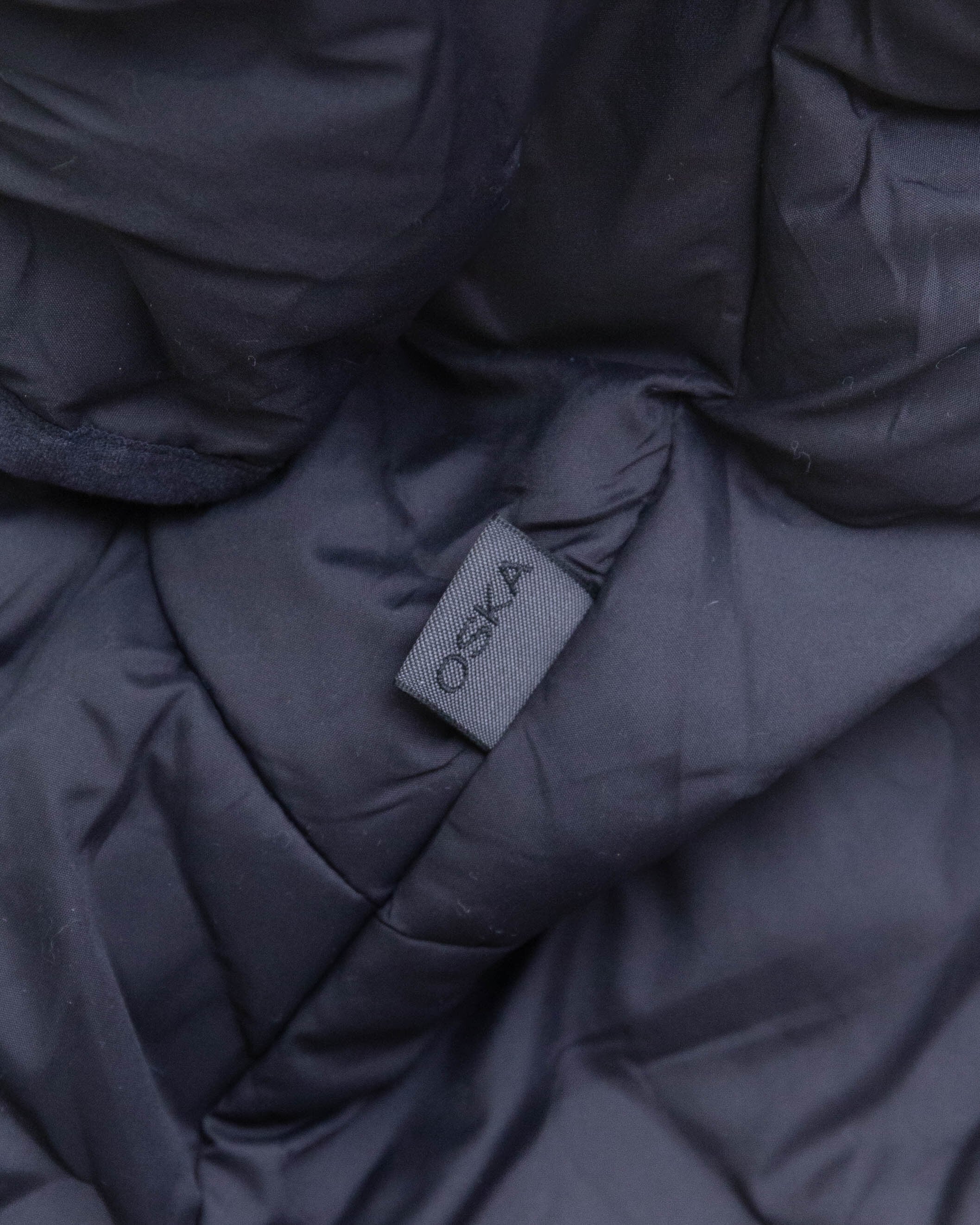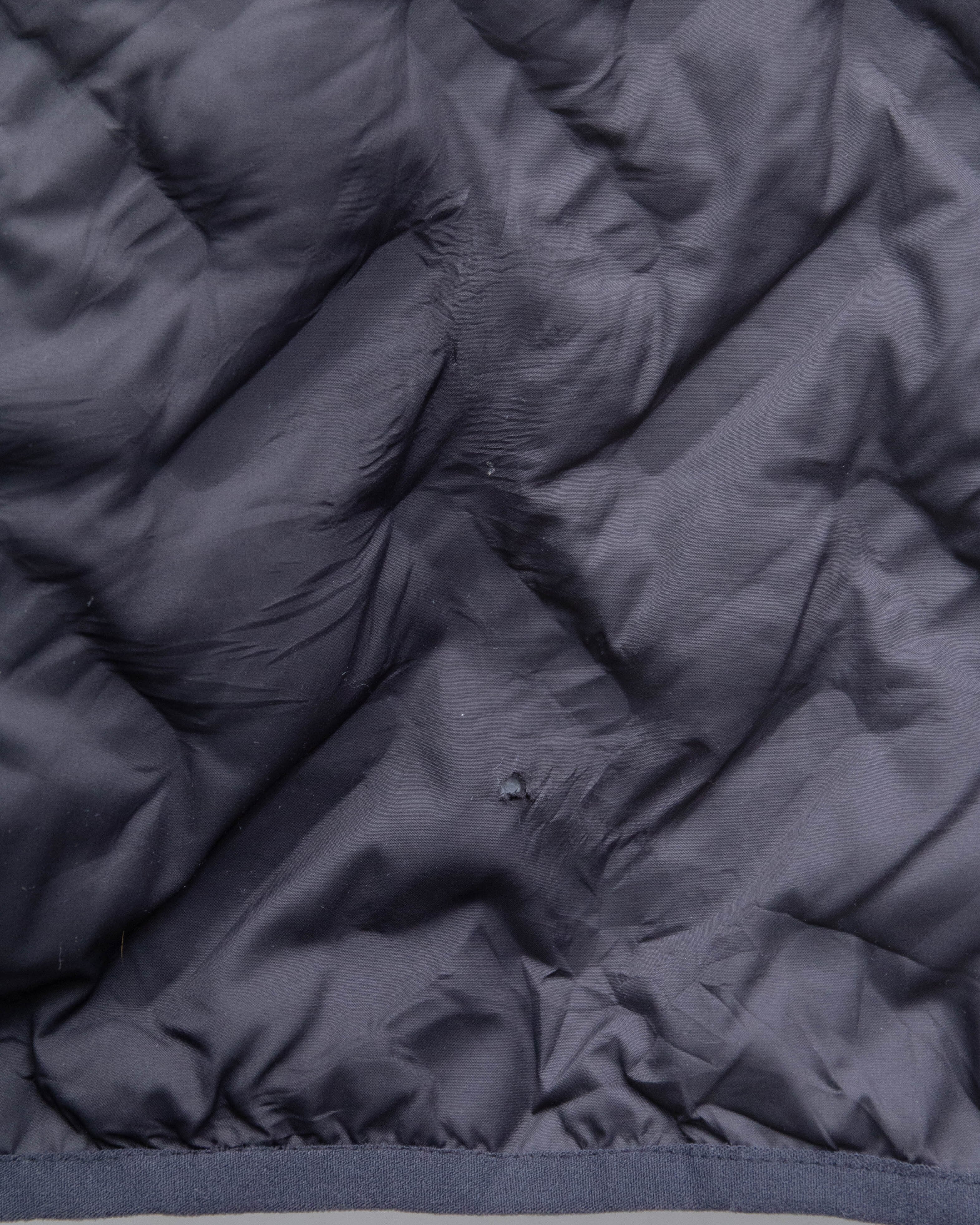 後身頃裾中央部に生地の縮みと小穴がございます。添付写真をご参照ください。
