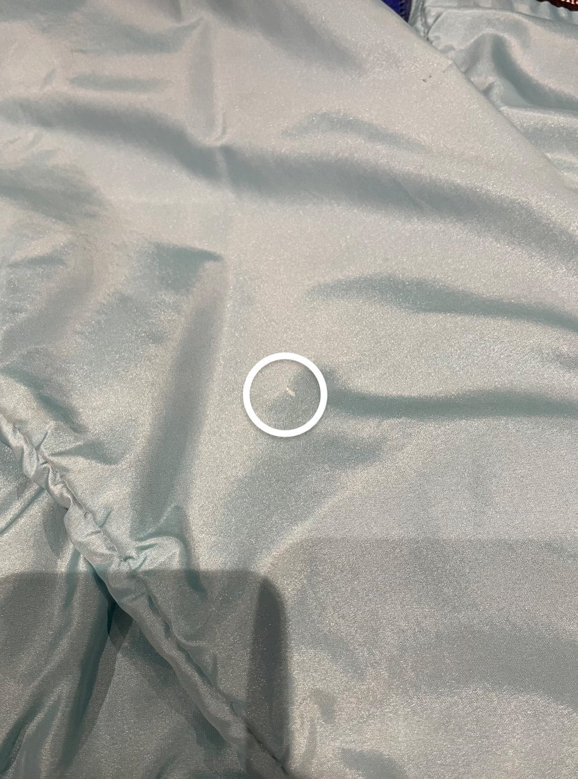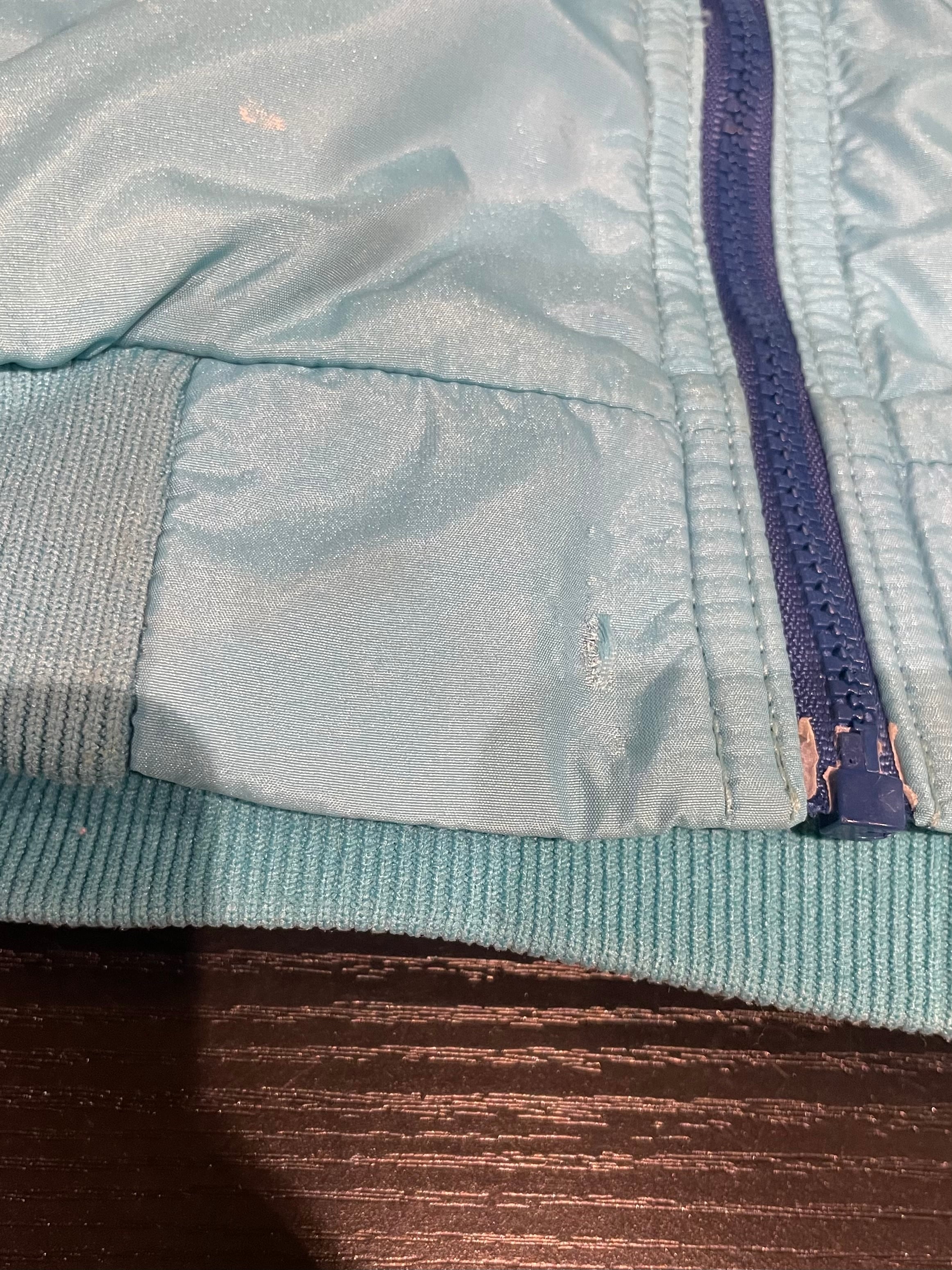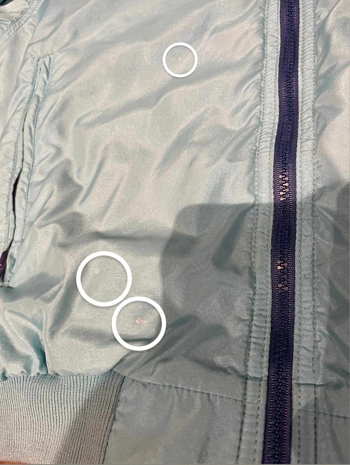 前身頃裾にダメージ、右腹部、裾付近と右袖にシミがございます。添付写真をご参照ください。