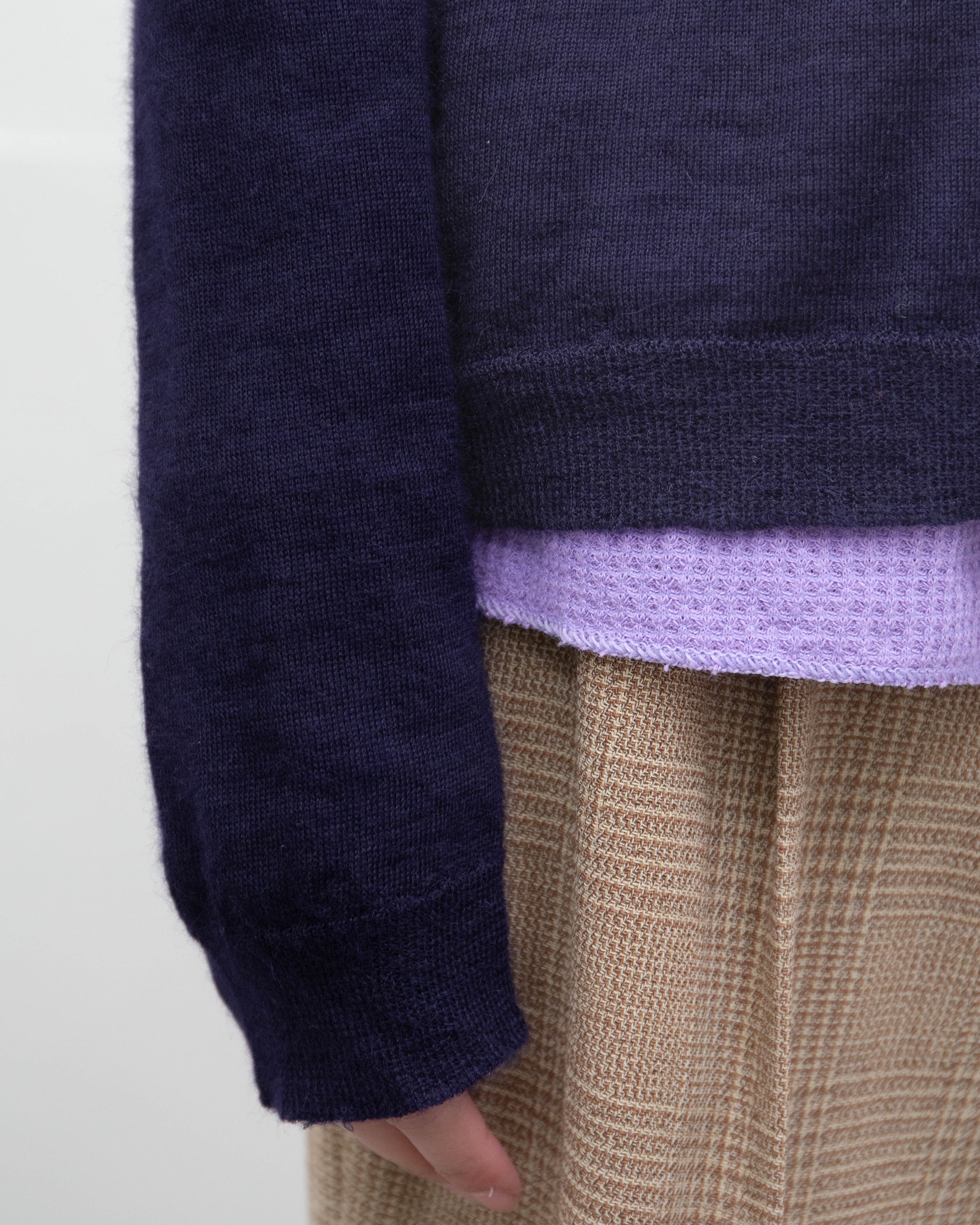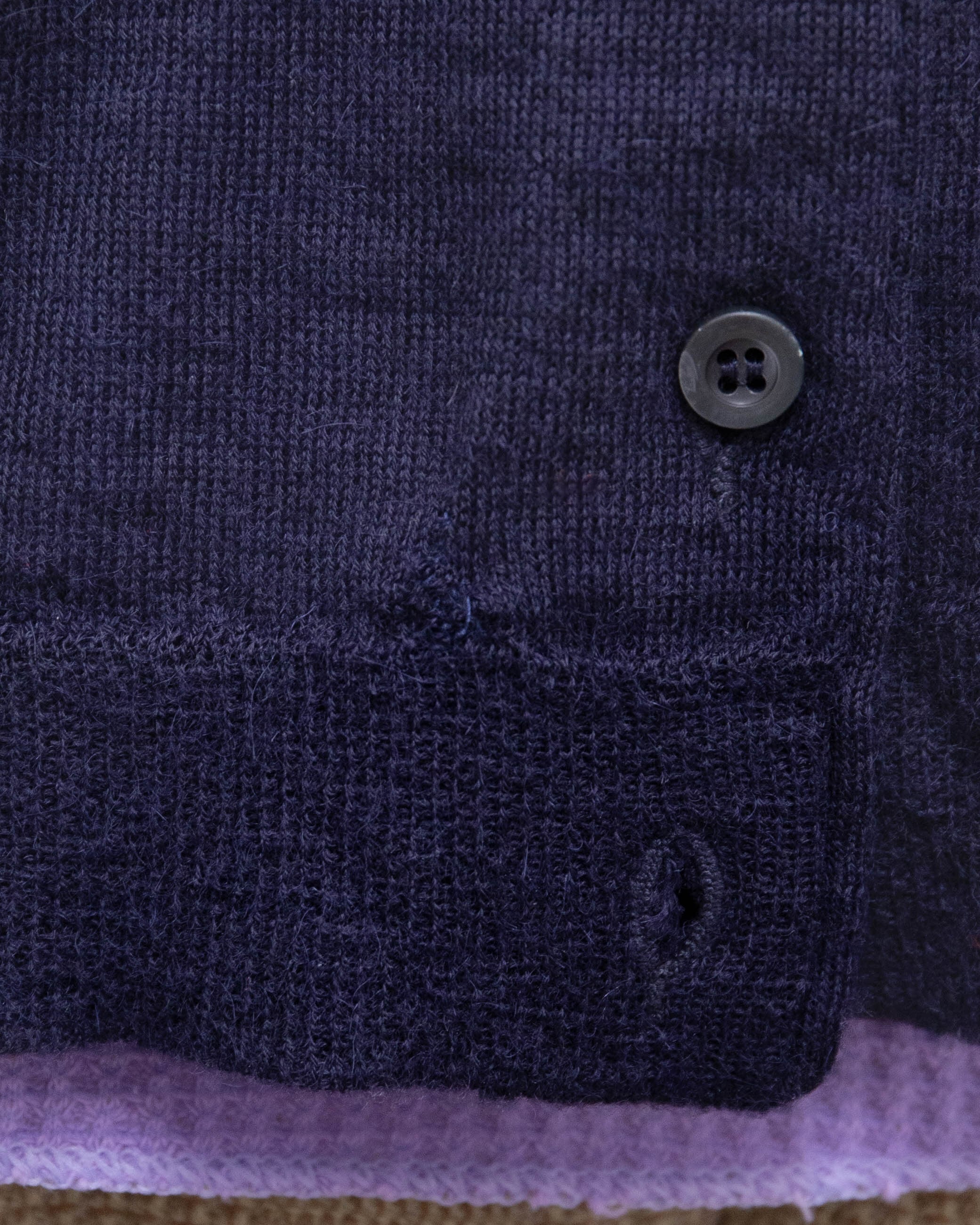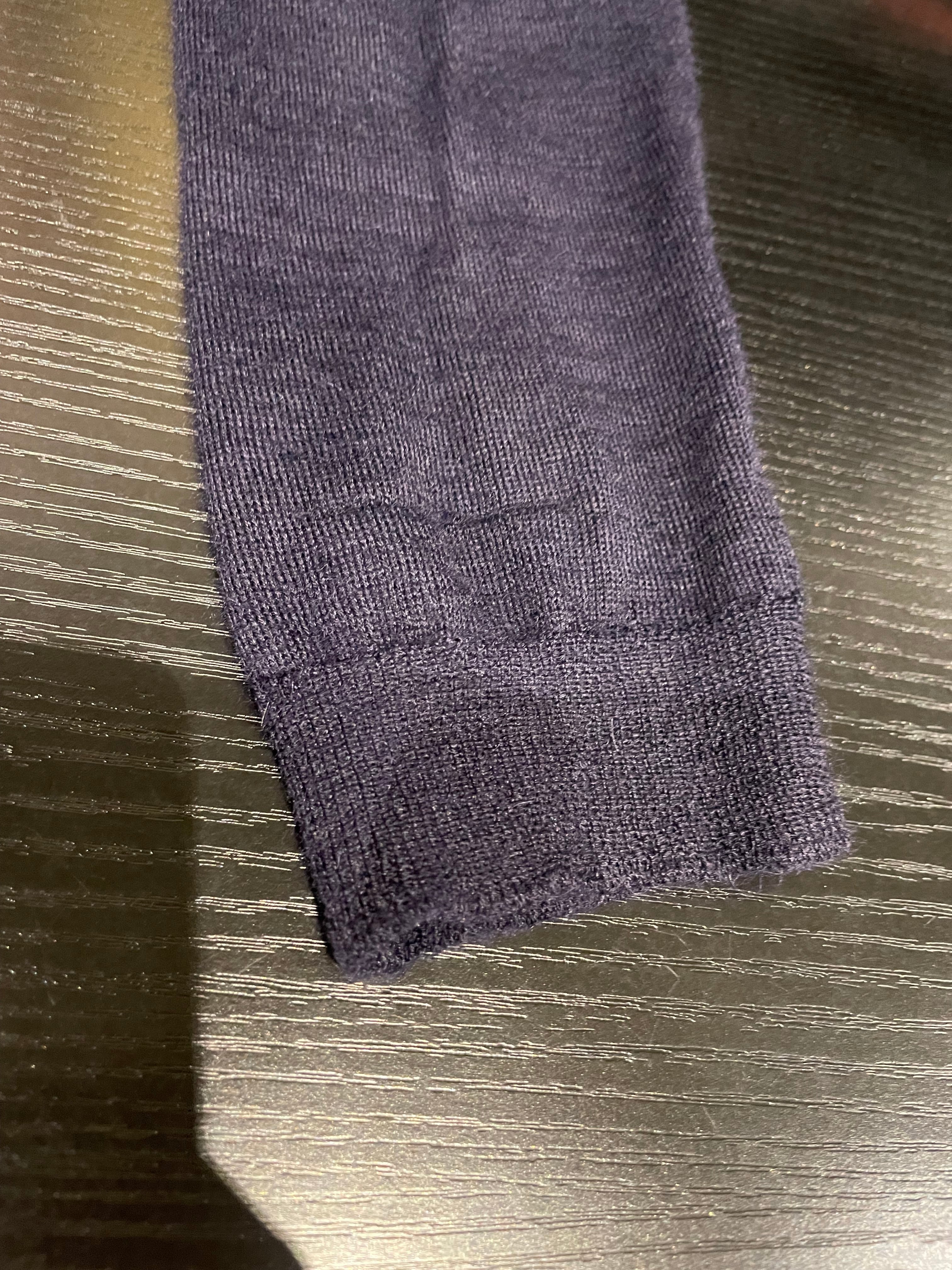 腹部右側、両袖下部に細かいほつれと糸引き、前身頃裾中央にリペア跡がございます。添付写真をご参照ください。