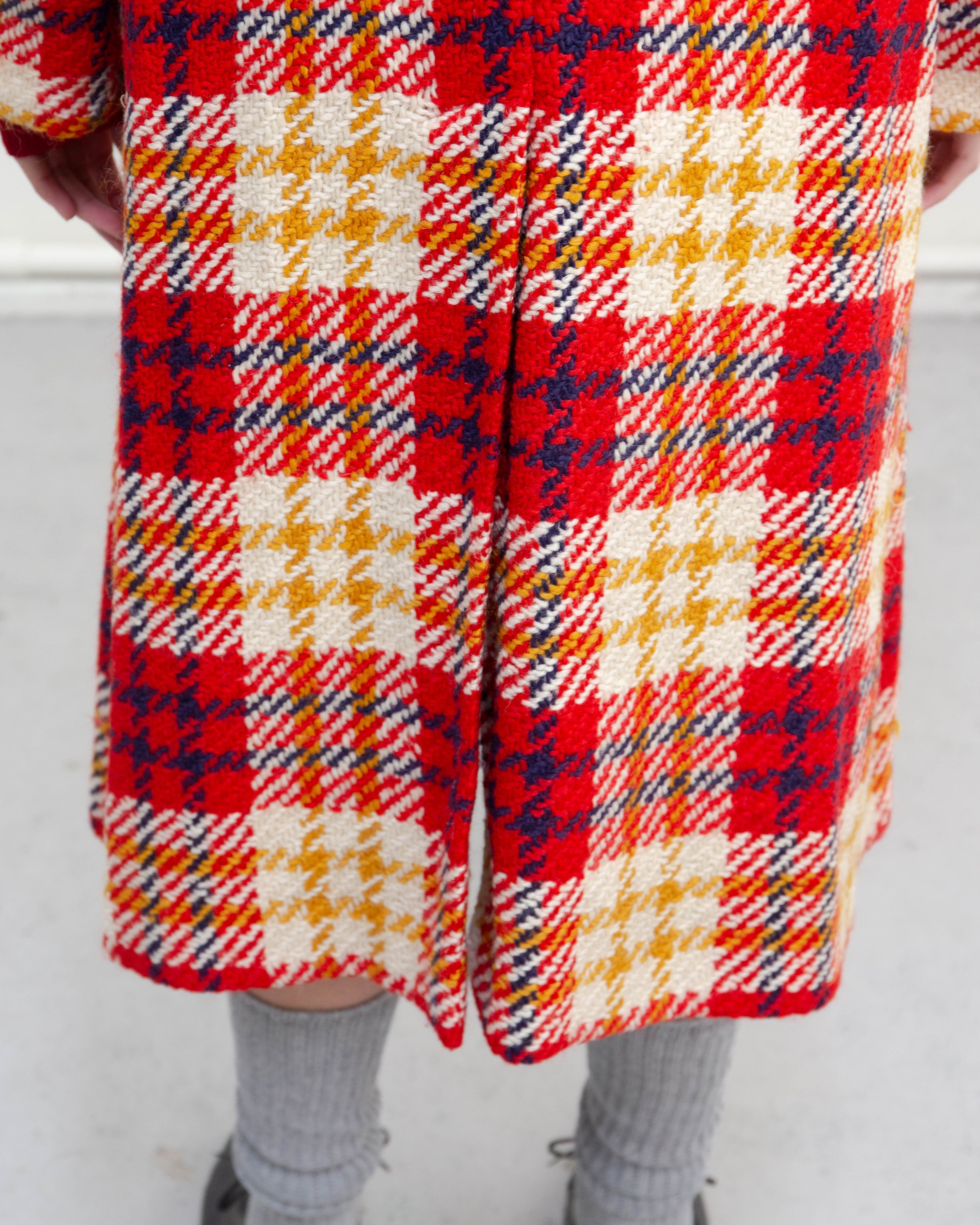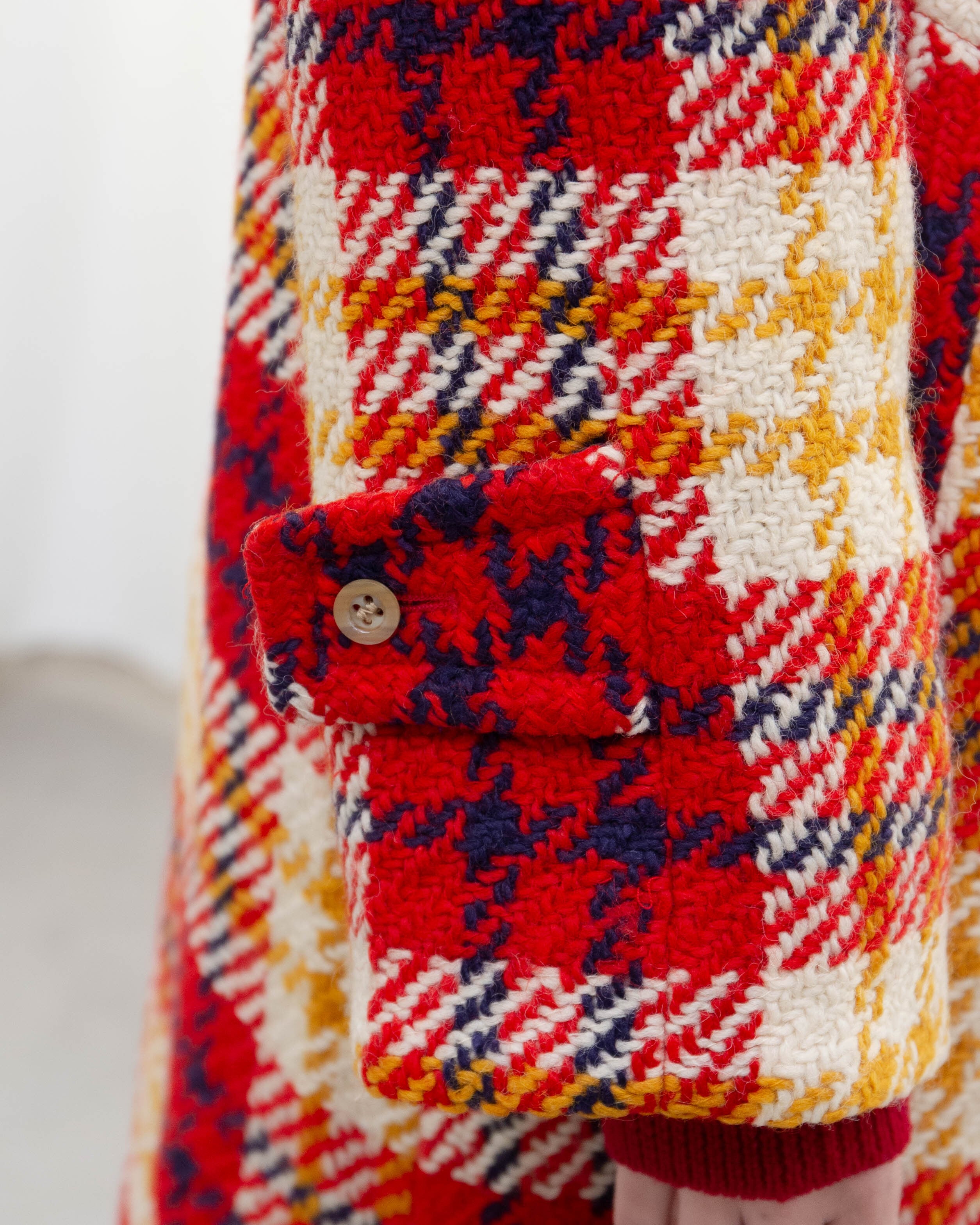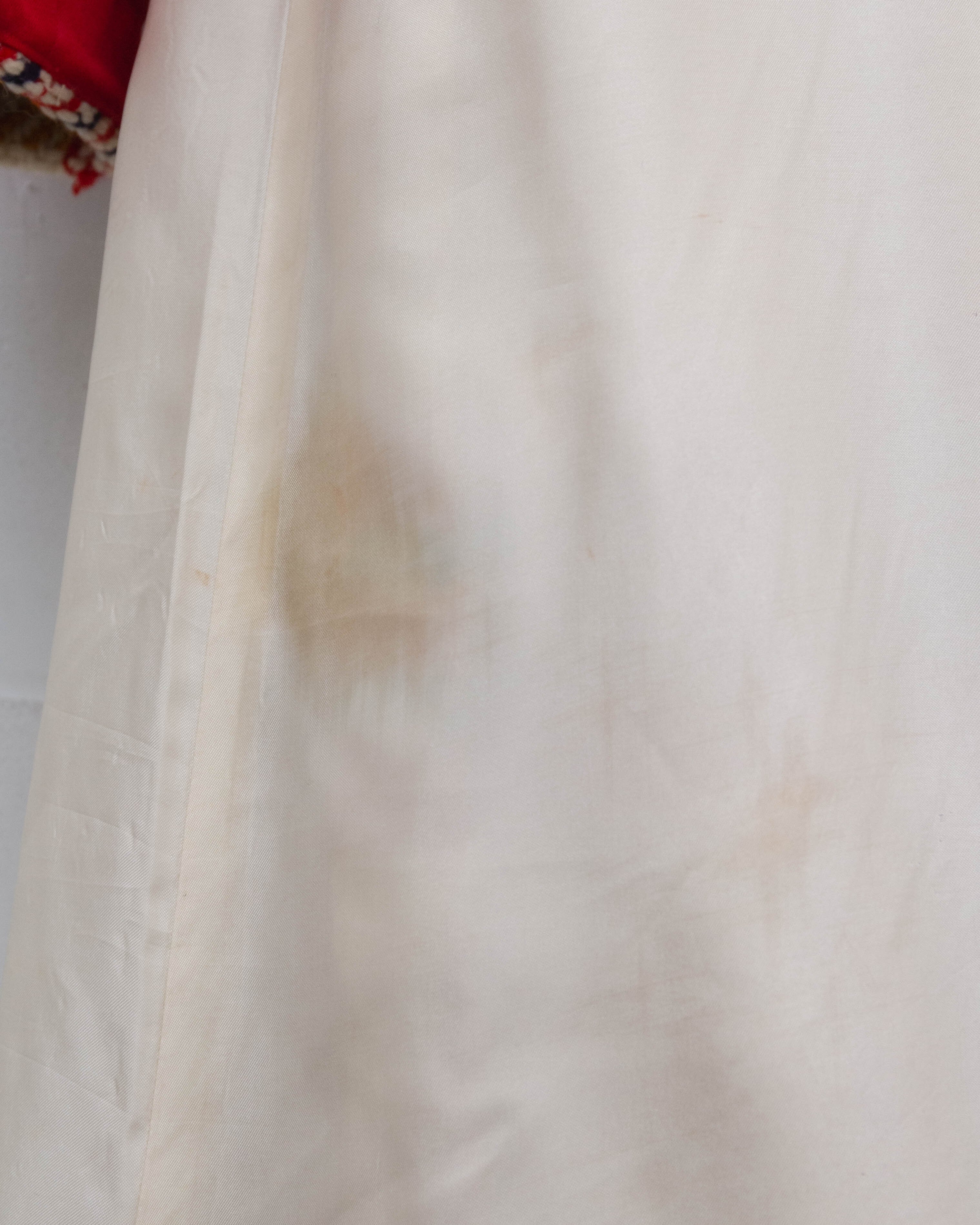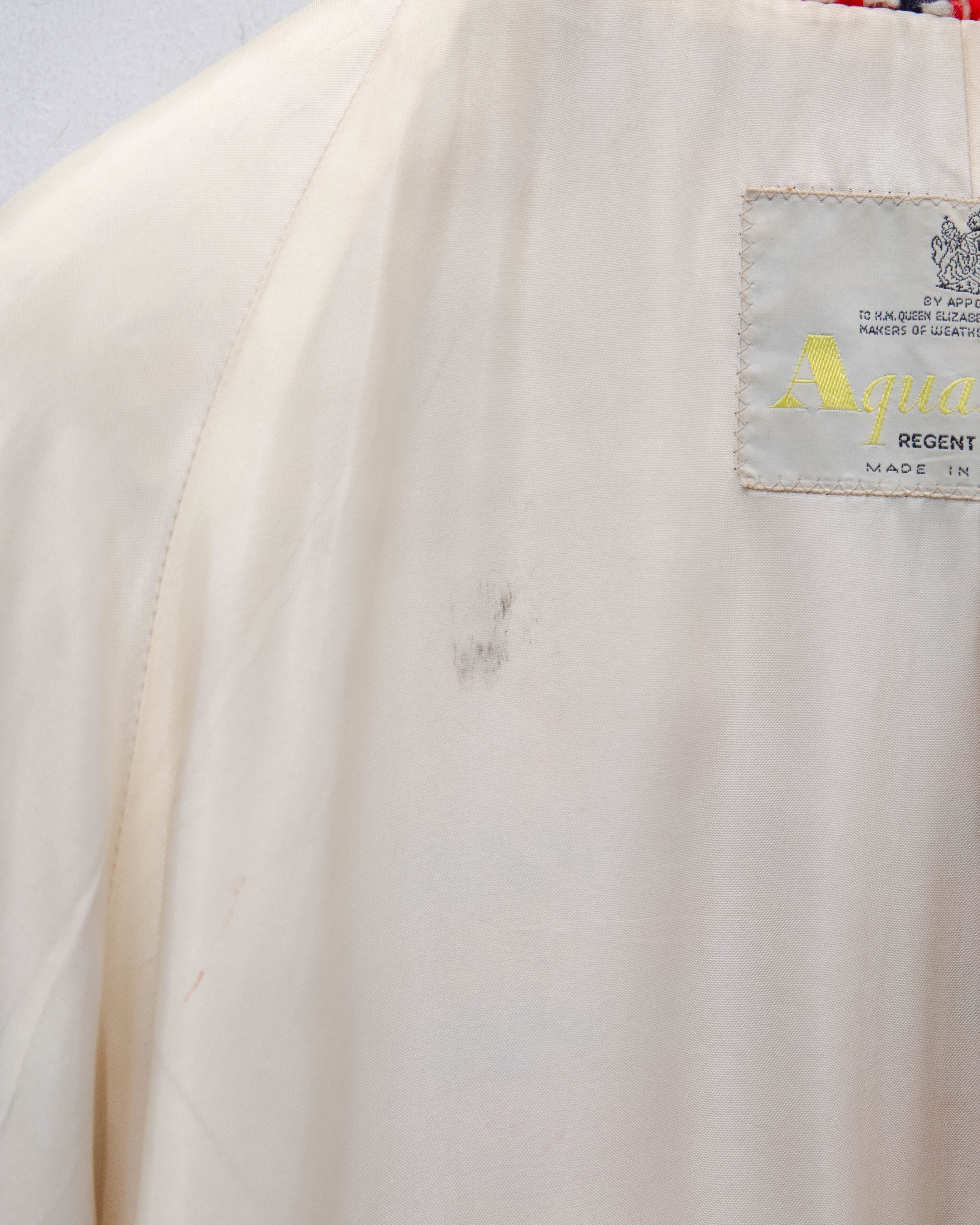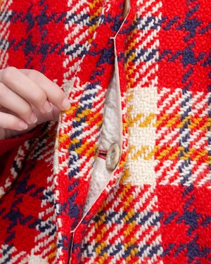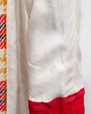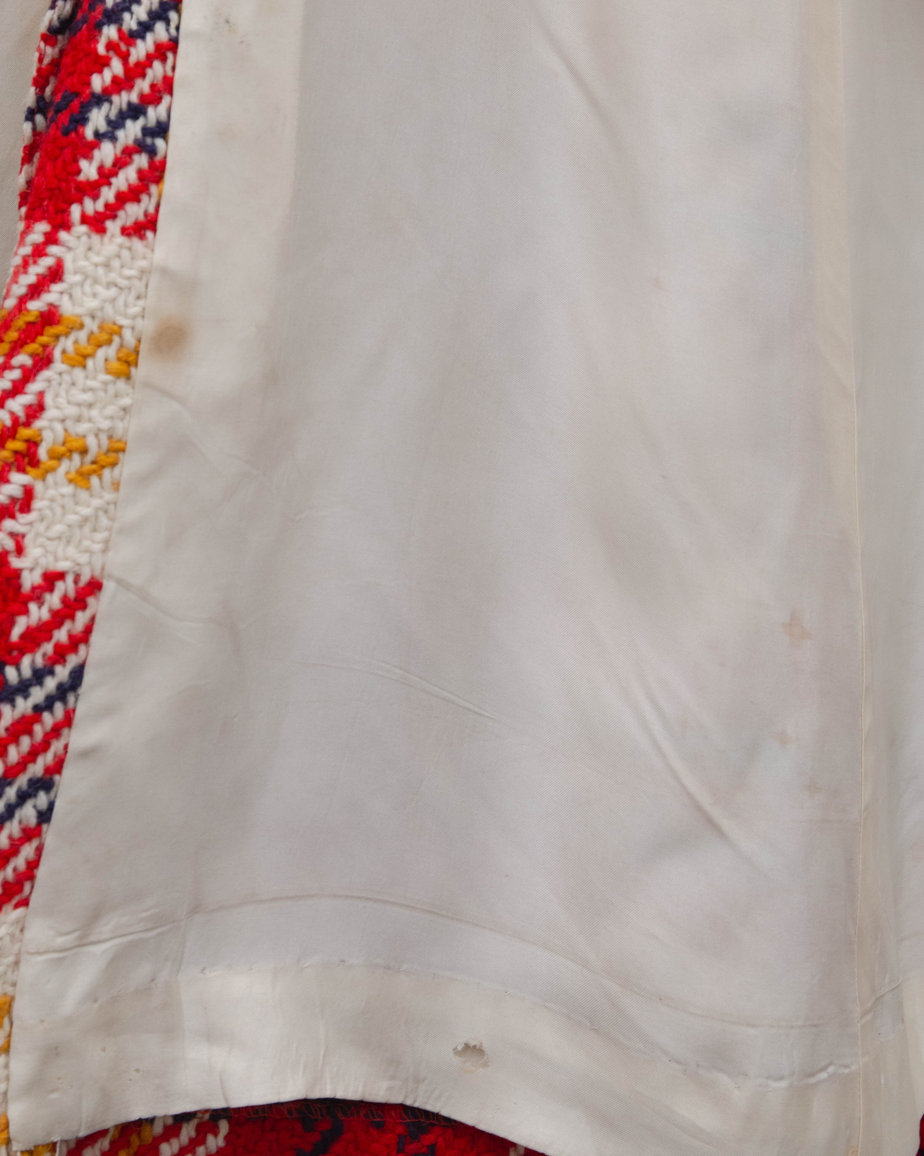 表地右ポケット下・裏地の一部にシミ、前身頃下部の裏地右に小穴、裏地の裾に破れが2ヶ所ございます。添付写真をご参照ください。