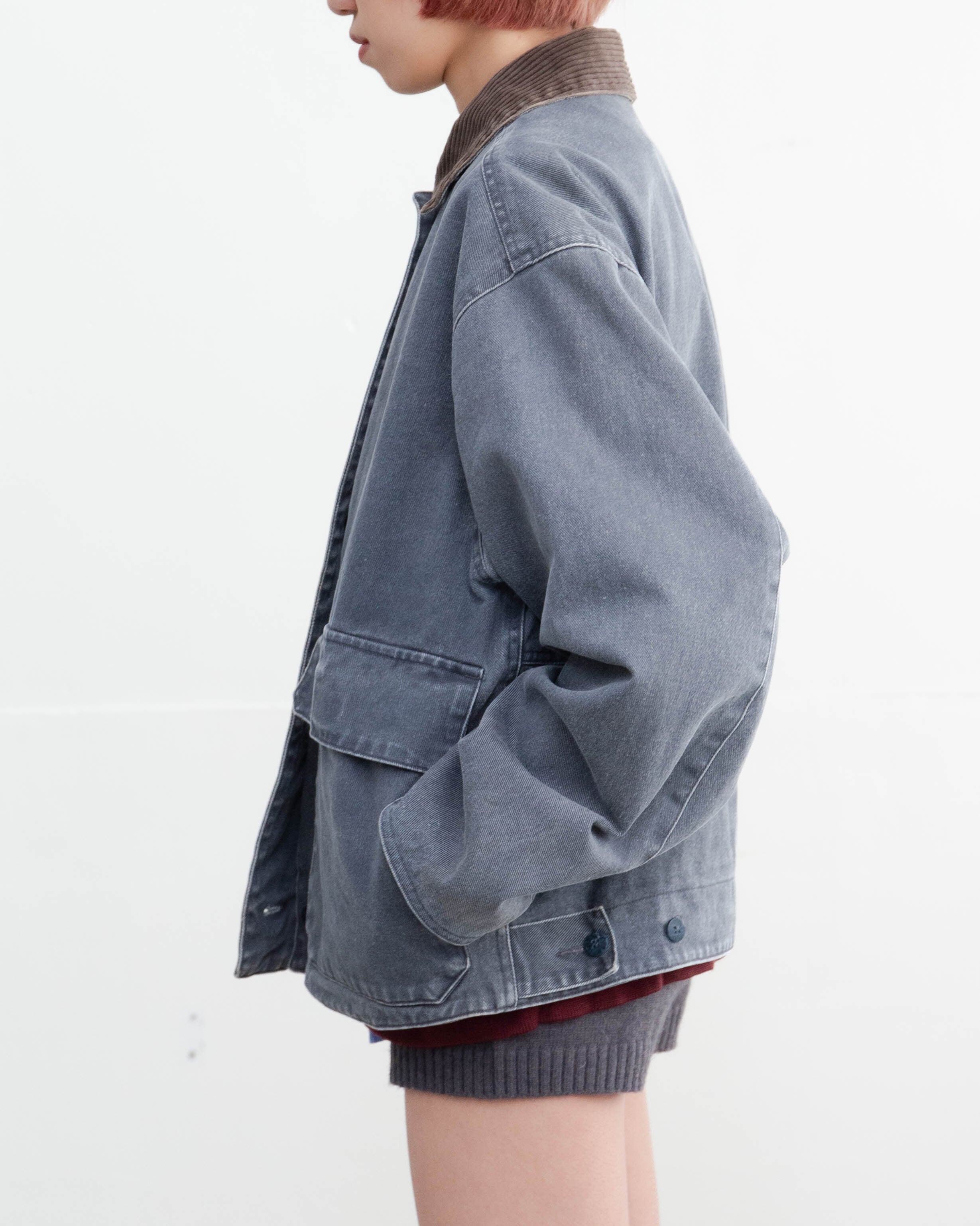 前身頃第3ボタン下部・後身頃下部・裏地右ポケット下部にシミがございます。添付写真をご参照ください。