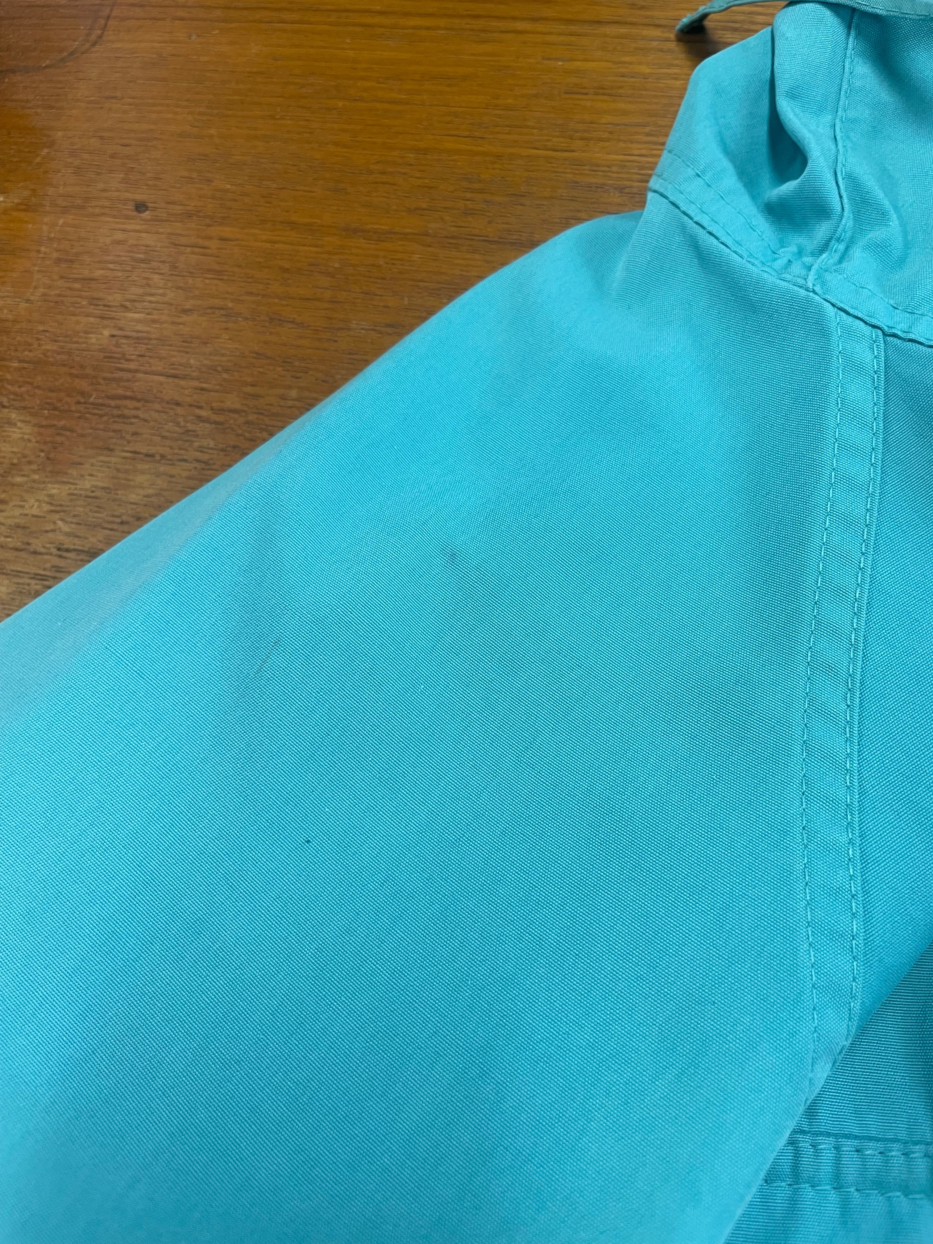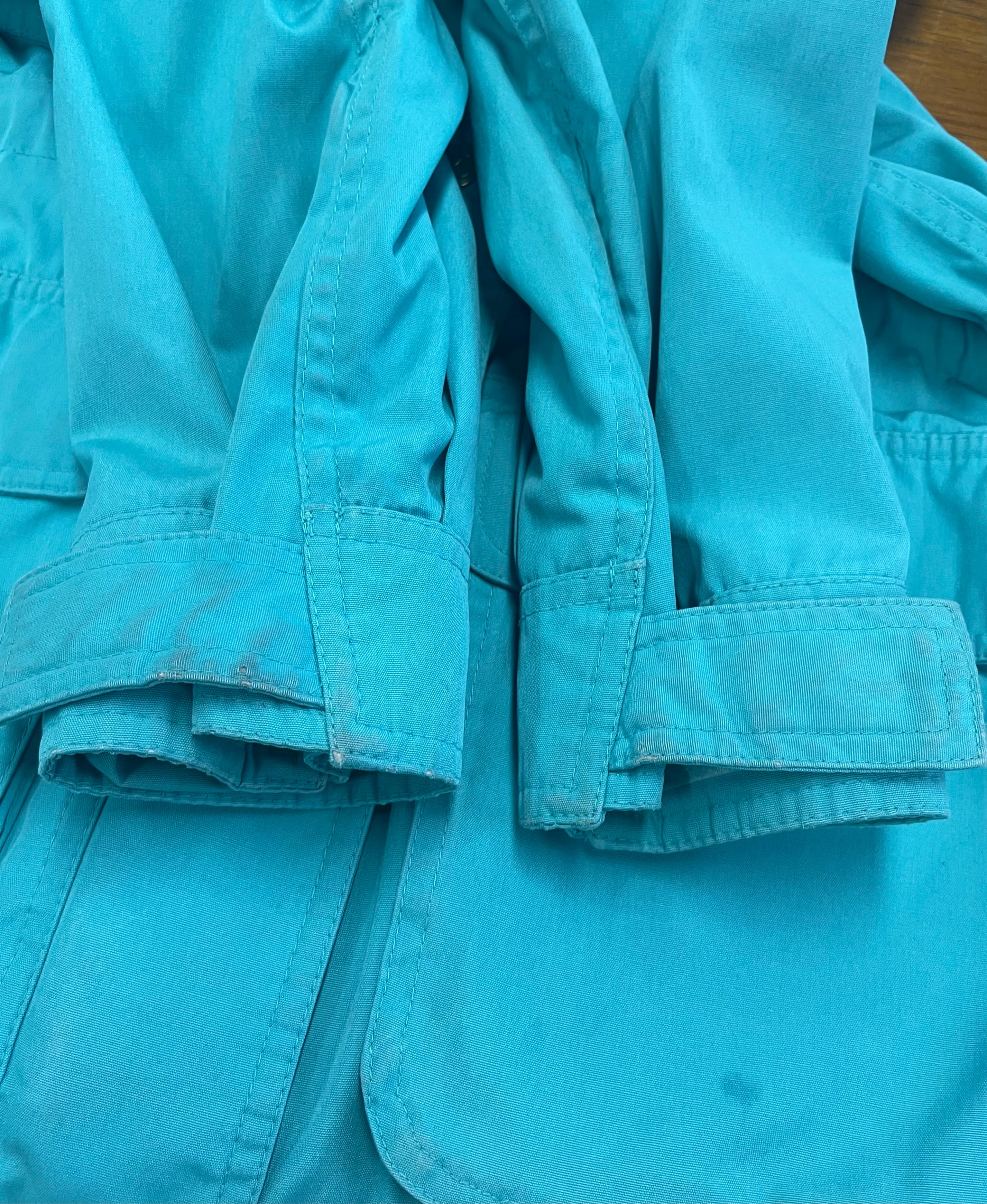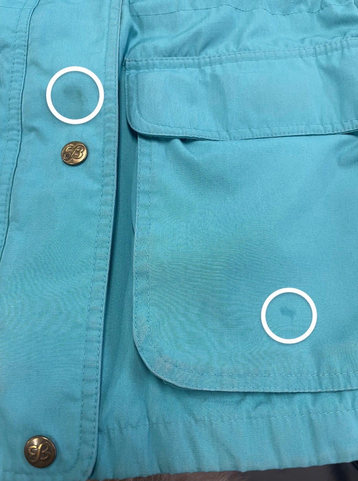 前身頃左下部ポケット・第5ボタン上部・右肩・両袖口、後身頃下部にシミ、裏地襟全体的に色褪せ、裏地フード左側にリペア跡が2ヶ所とほつれがございます。添付写真をご参照ください。