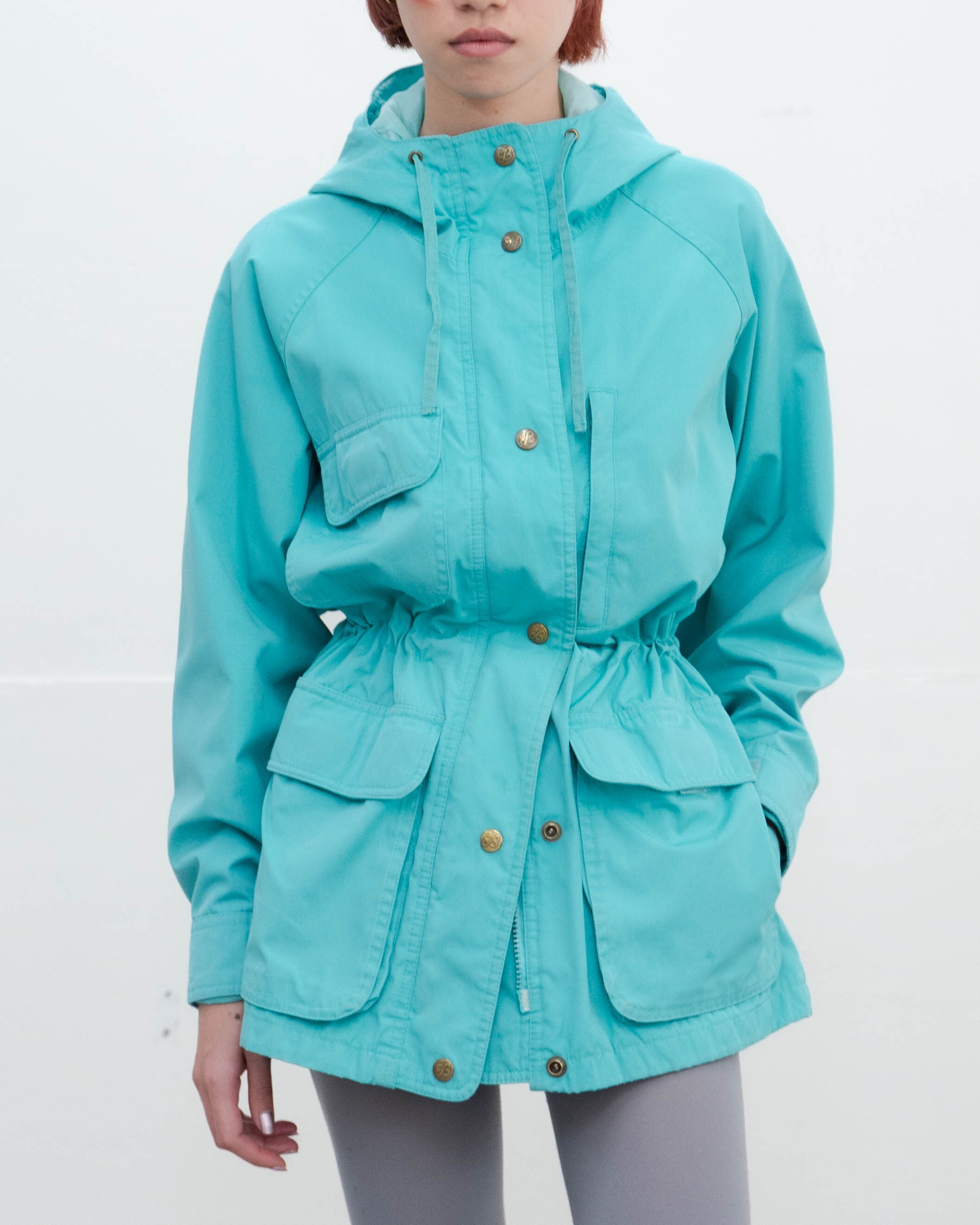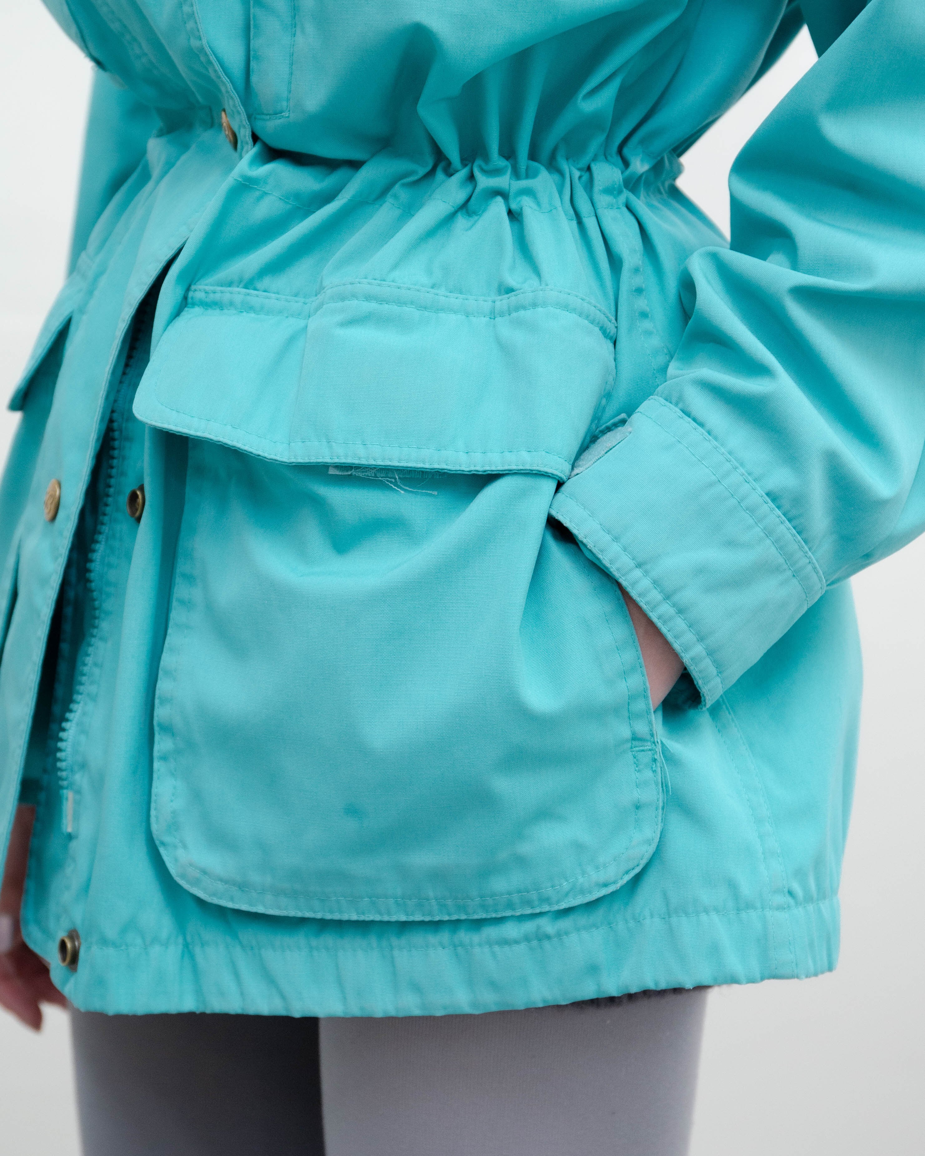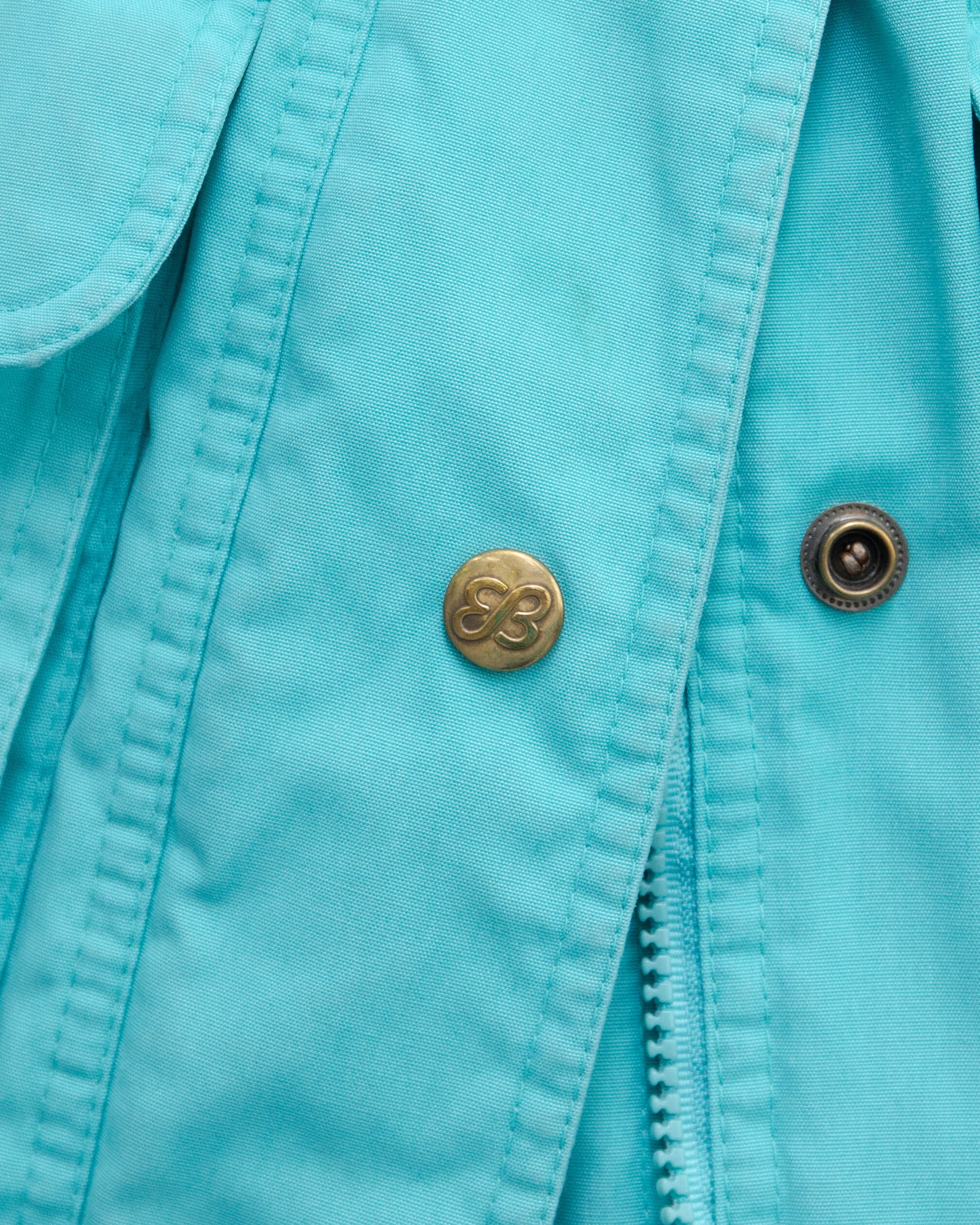 前身頃左下部ポケット・第5ボタン上部・右肩・両袖口、後身頃下部にシミ、裏地襟全体的に色褪せ、裏地フード左側にリペア跡が2ヶ所とほつれがございます。添付写真をご参照ください。