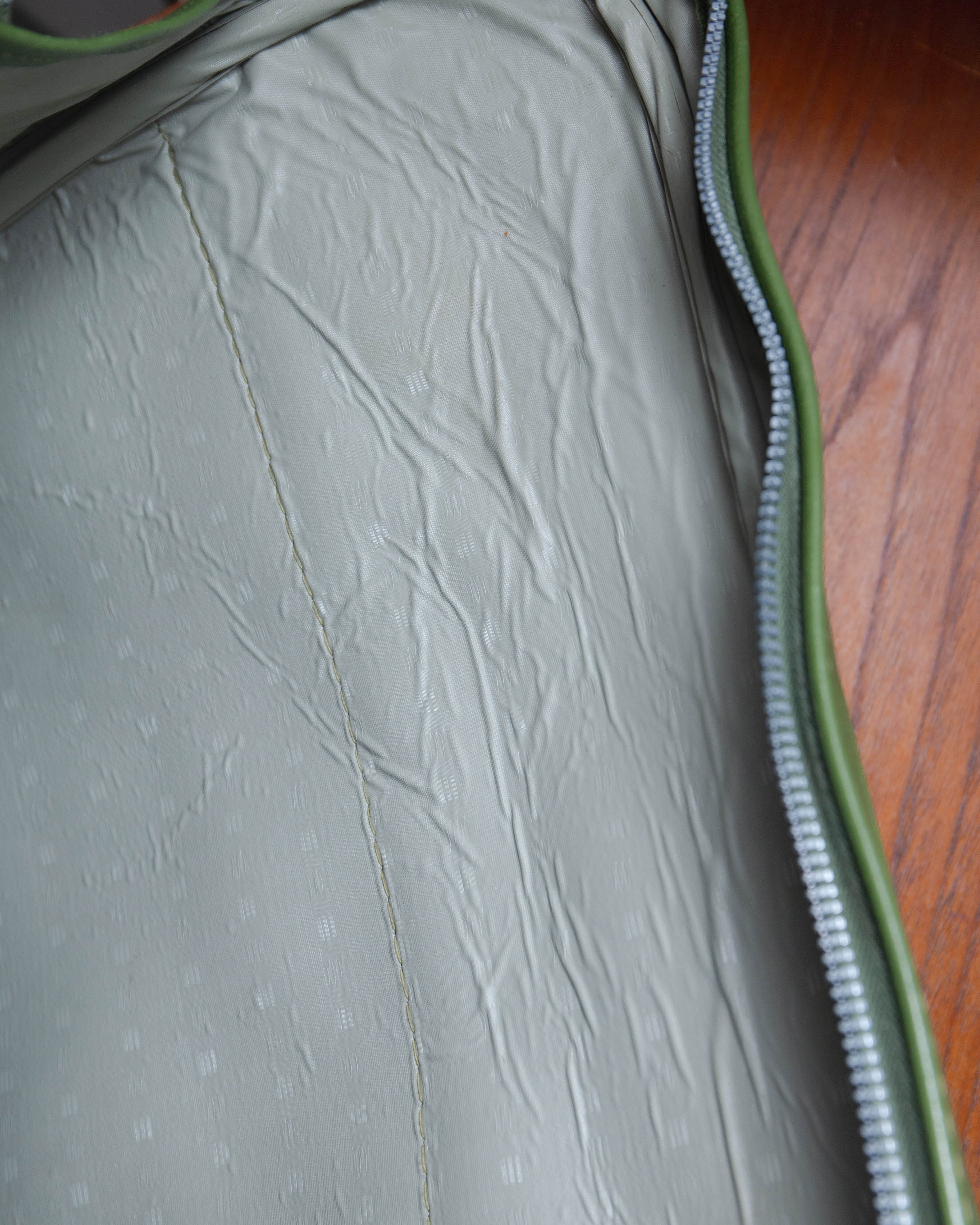 サイドプレート部分にダメージ、裏地に経年に伴う剥離、底サイドにシミがございます。添付写真をご参照下さい。
