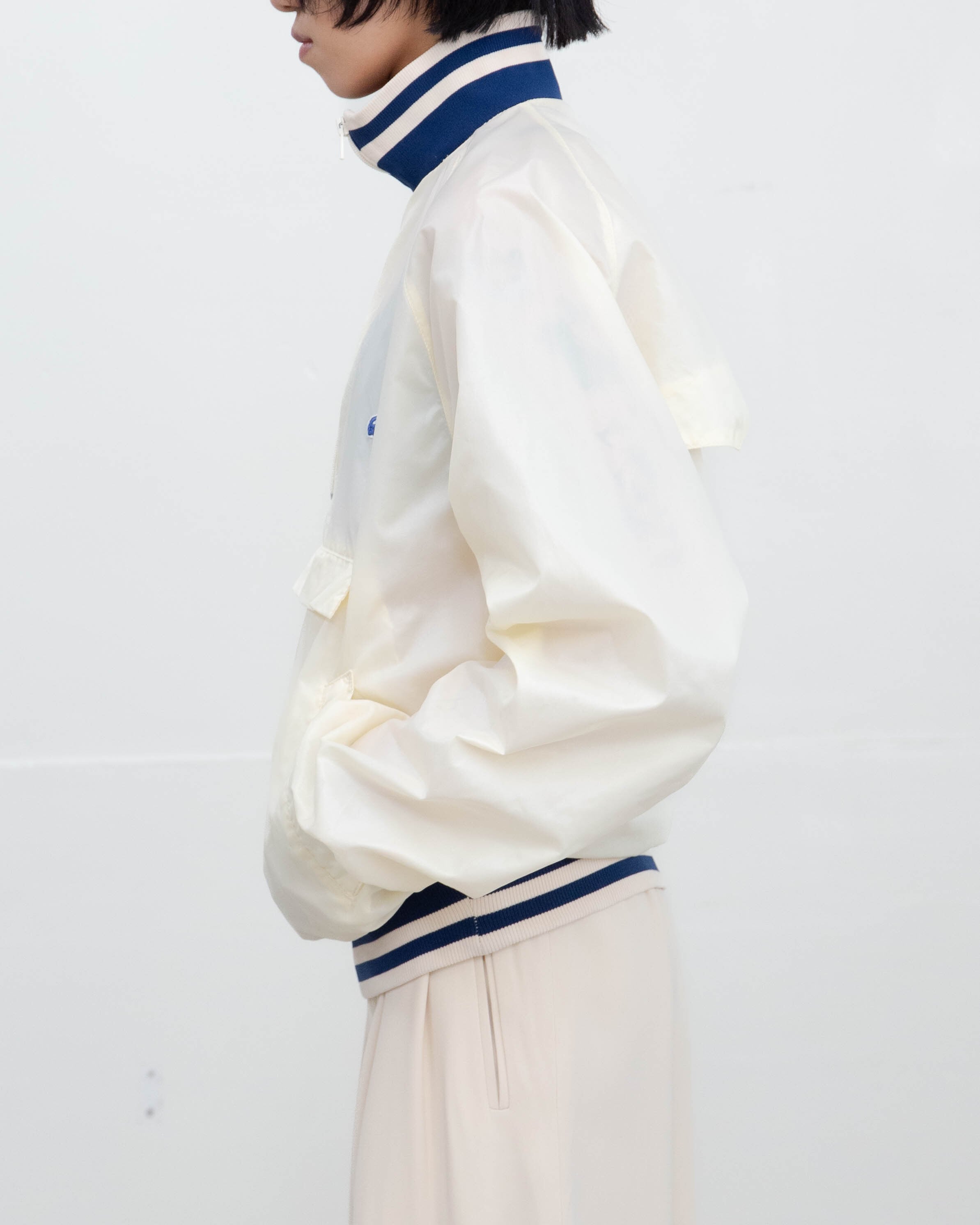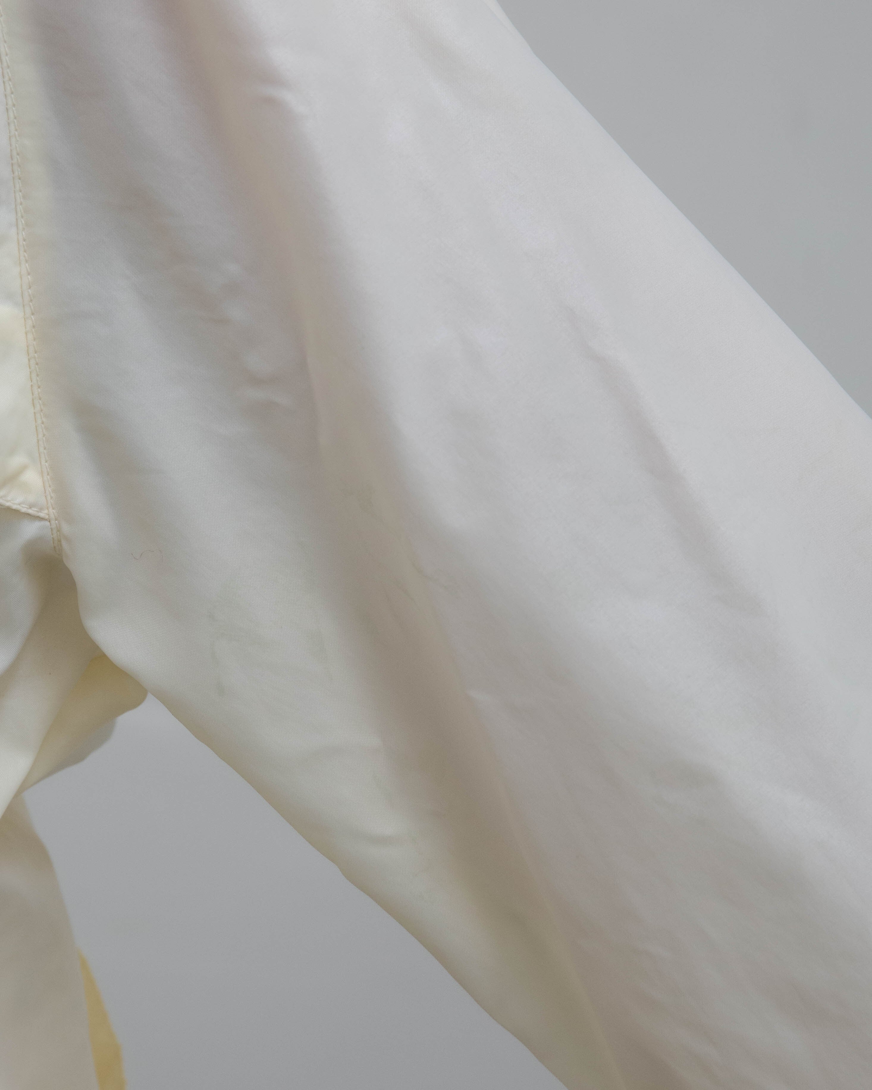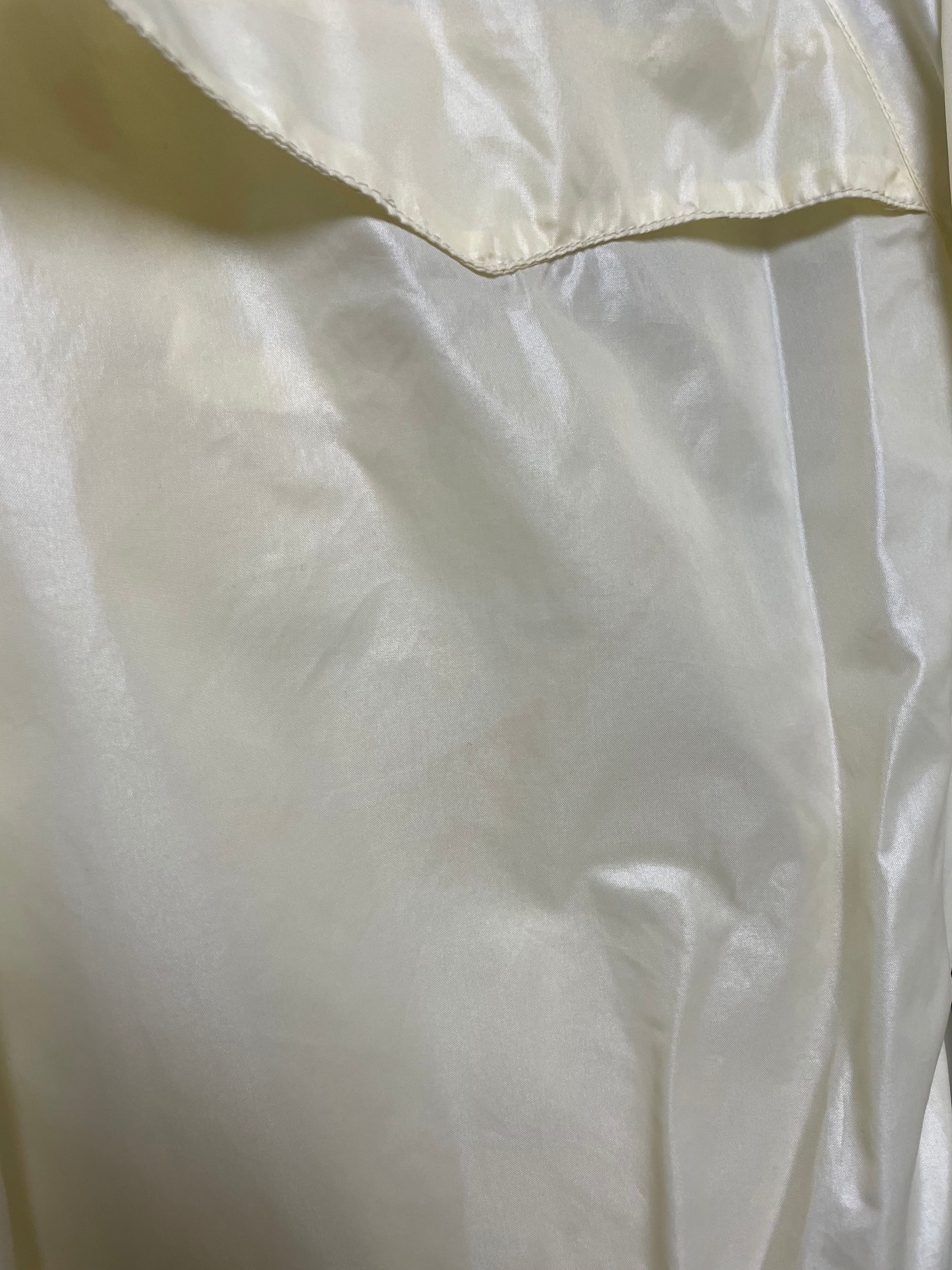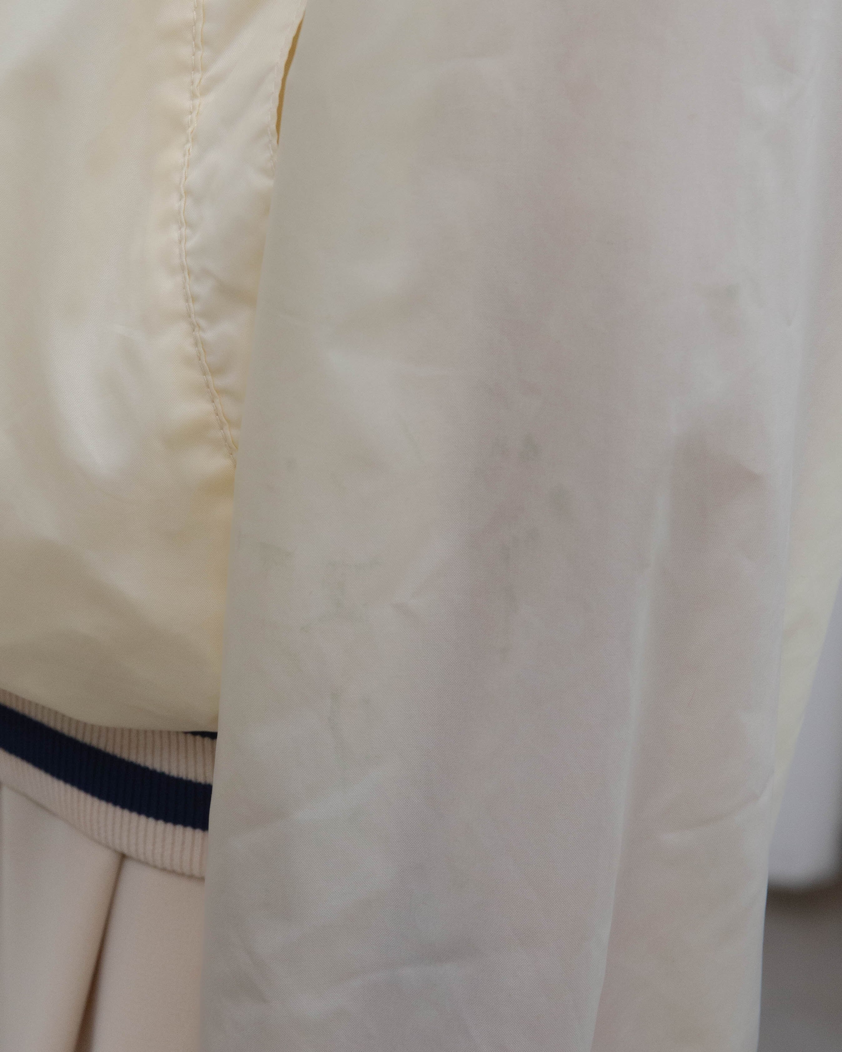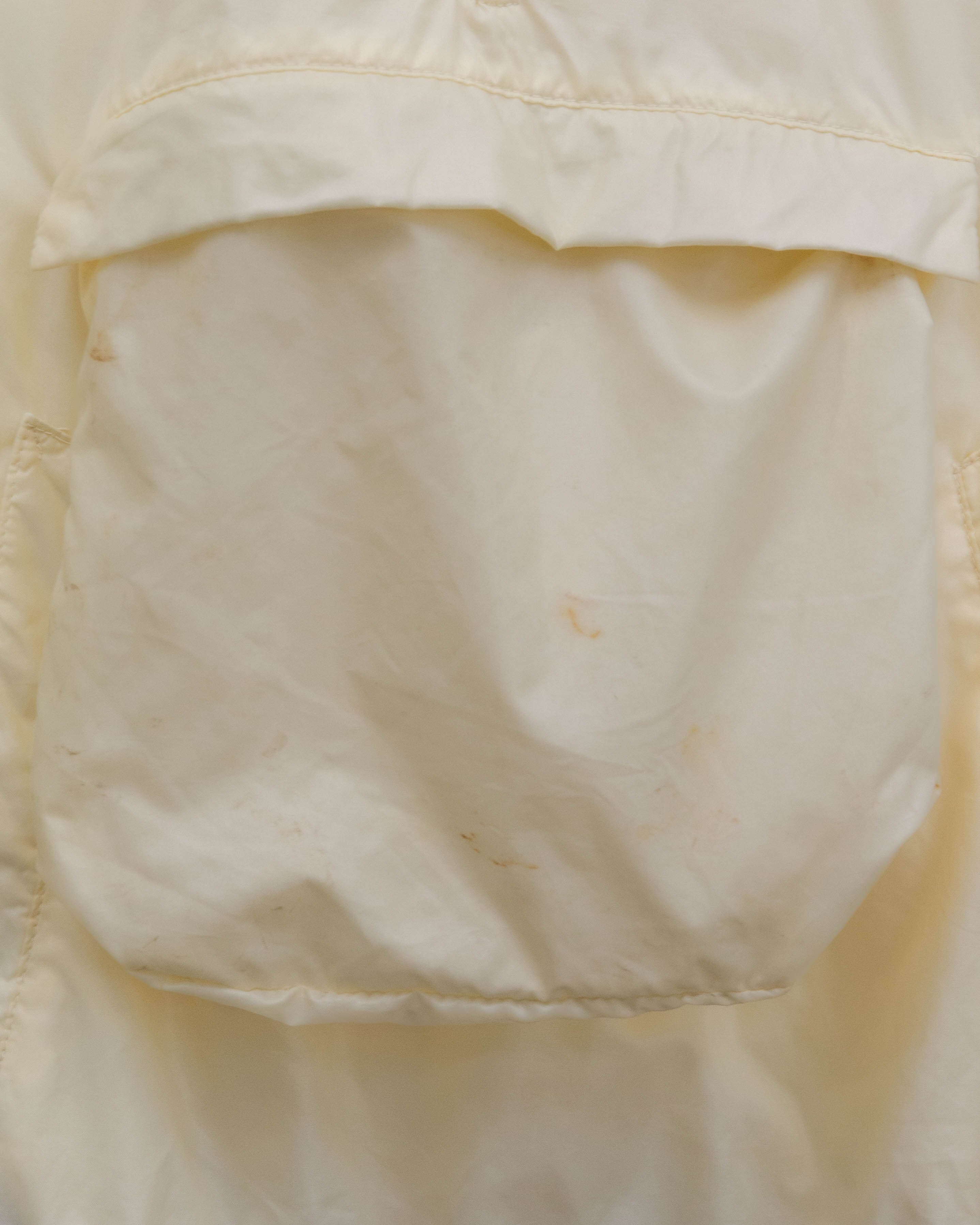 後身頃右下部、右袖下部、左袖全体、首と裾リブ、フロントポッケ裏地にシミ、色移りがございます。添付写真をご参照ください。