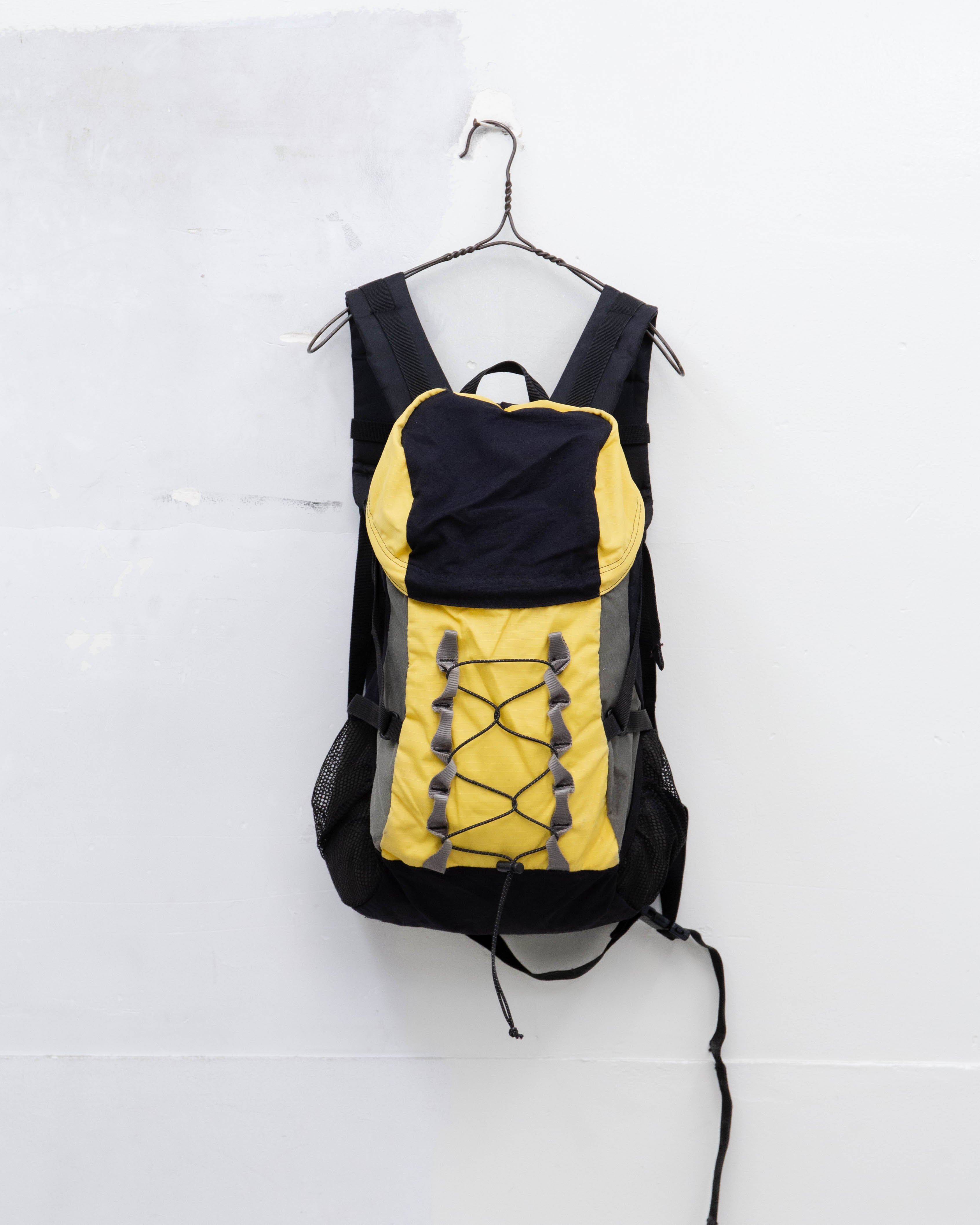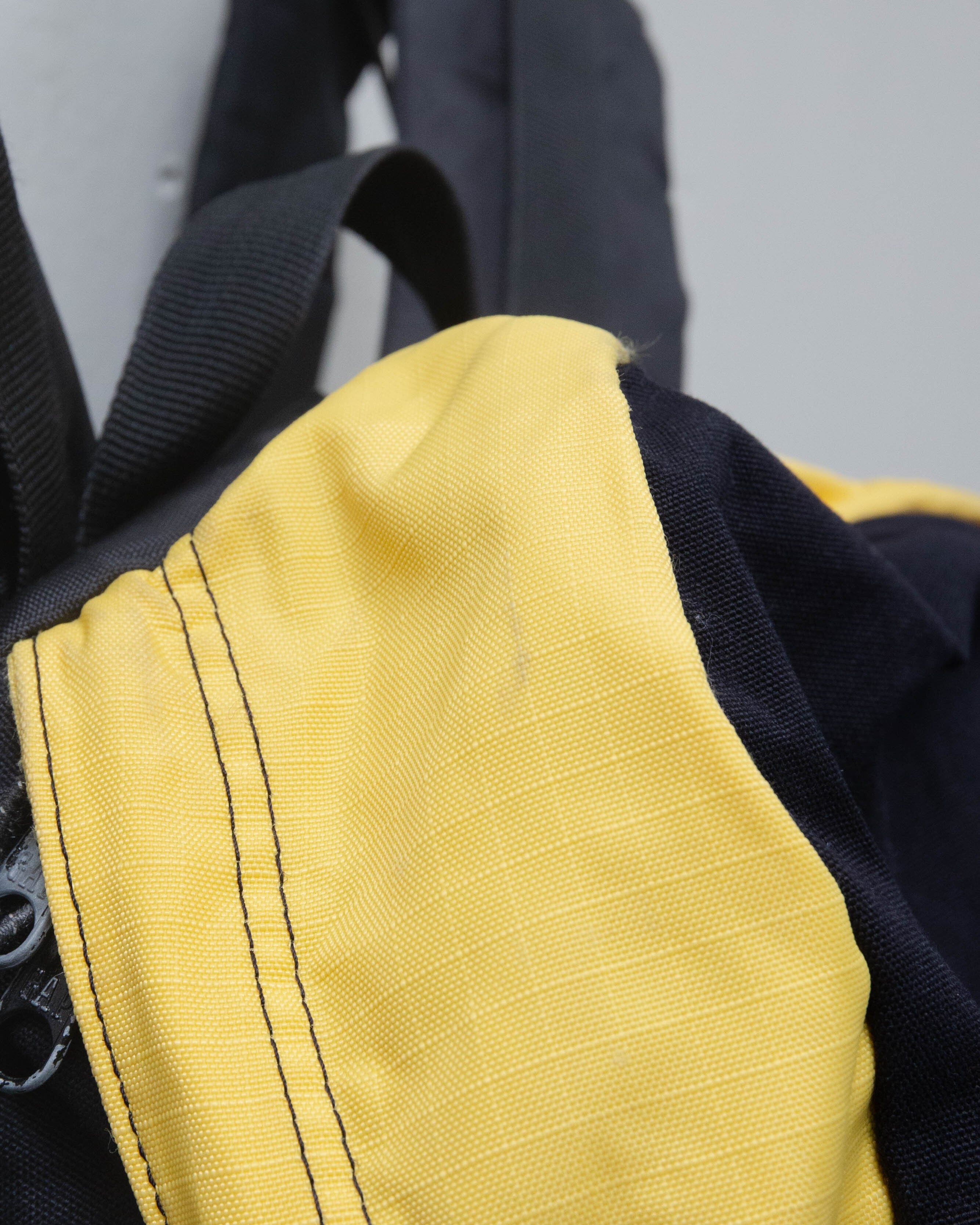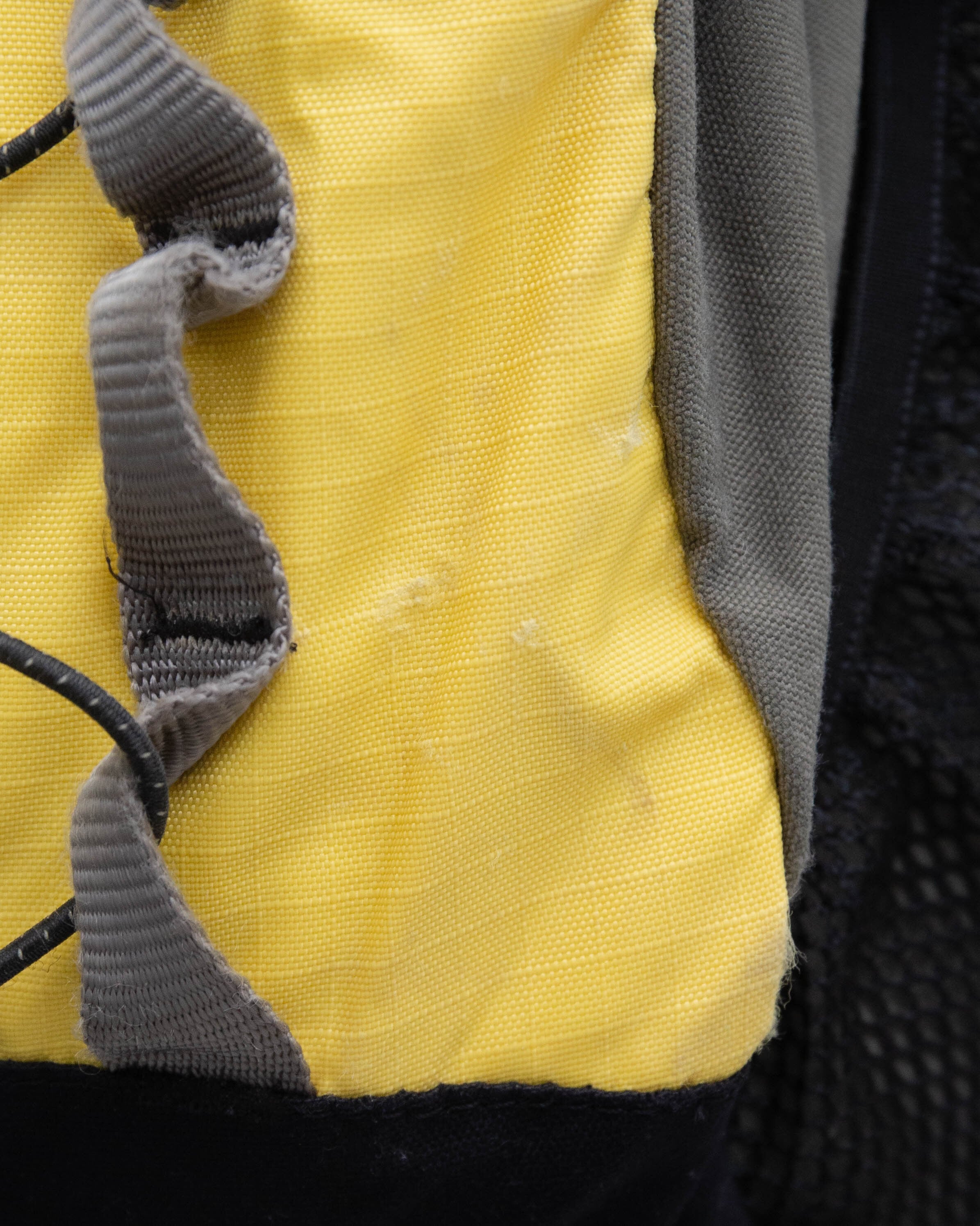 蓋部分とフロント部分のイエロー面、底マチ部分全体的にシミ・擦れダメージがございます。添付写真をご参照ください。