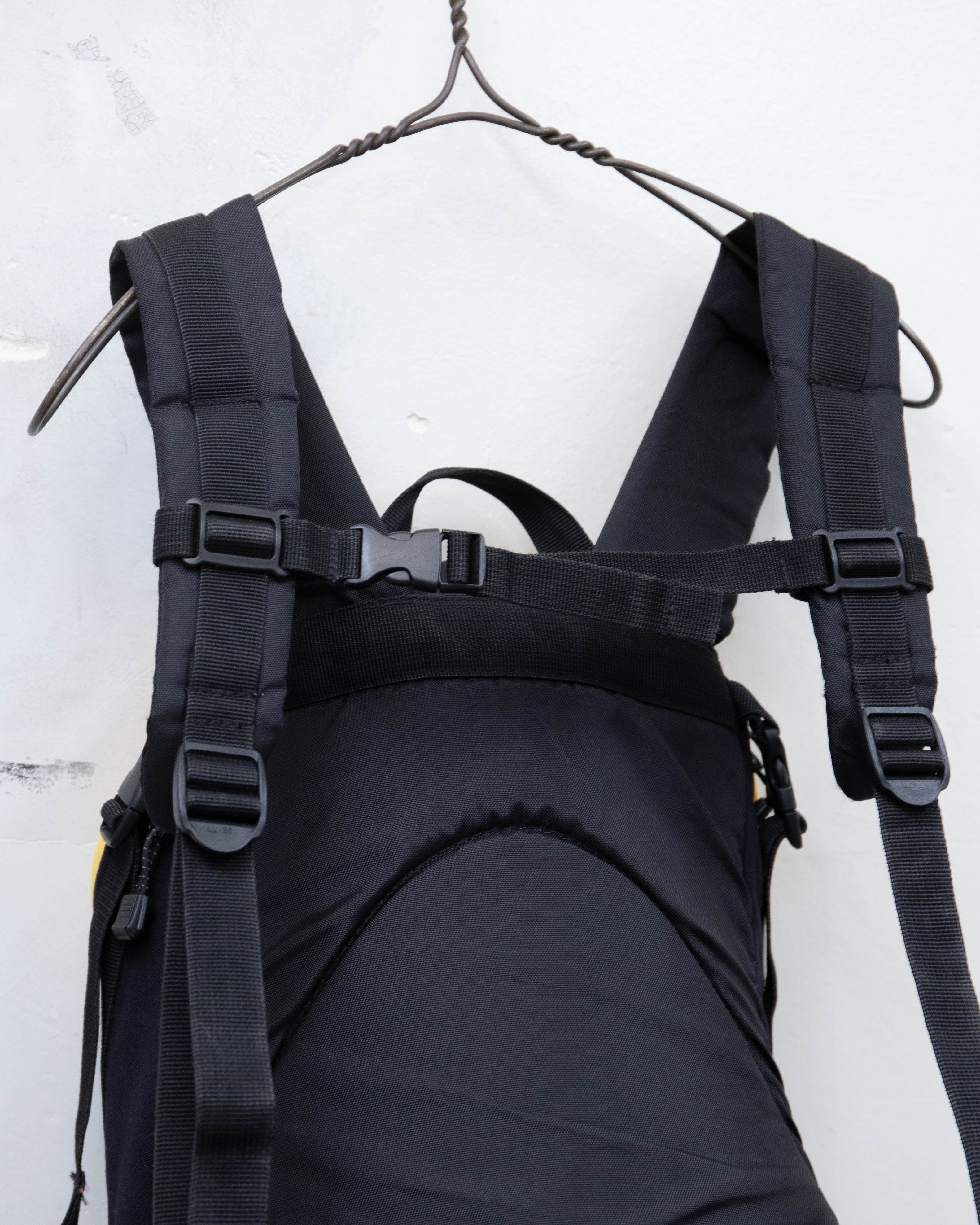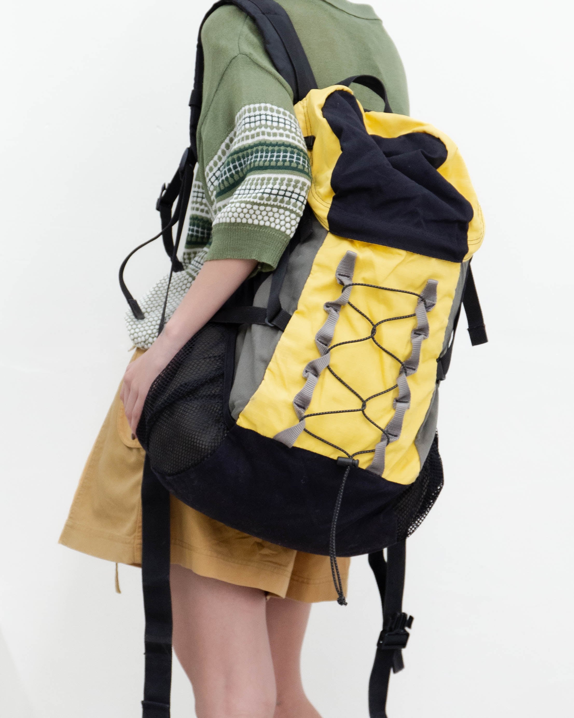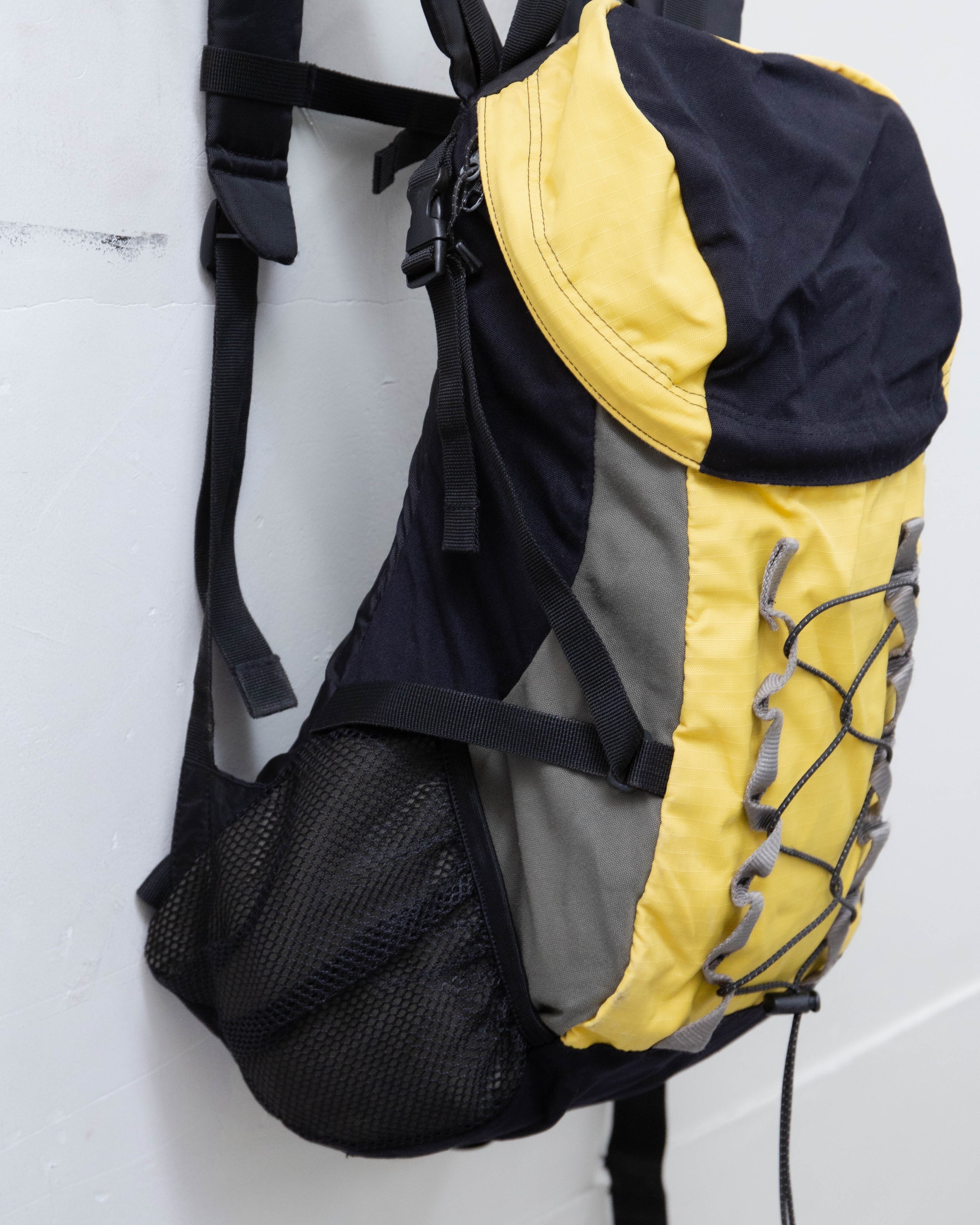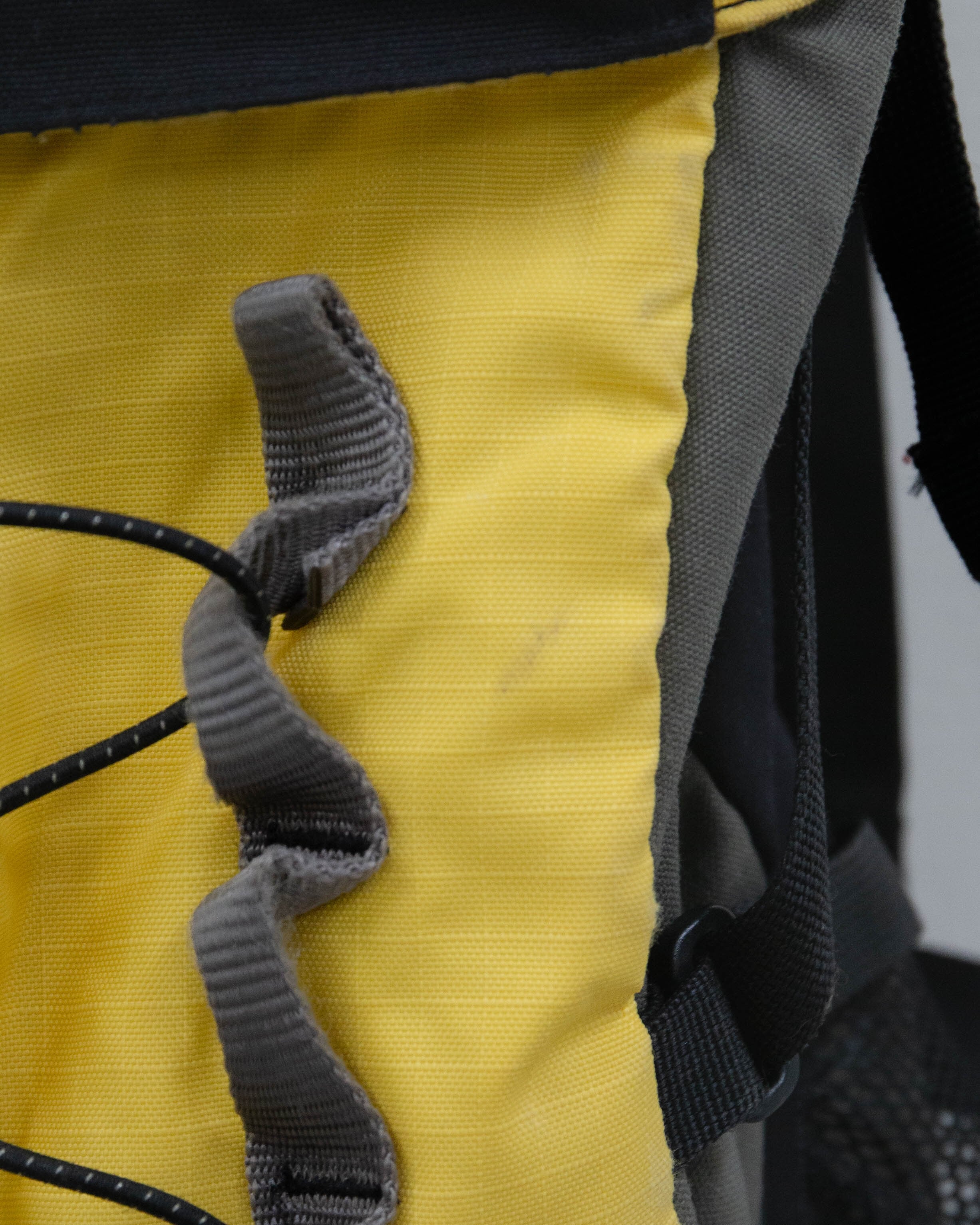蓋部分とフロント部分のイエロー面、底マチ部分全体的にシミ・擦れダメージがございます。添付写真をご参照ください。