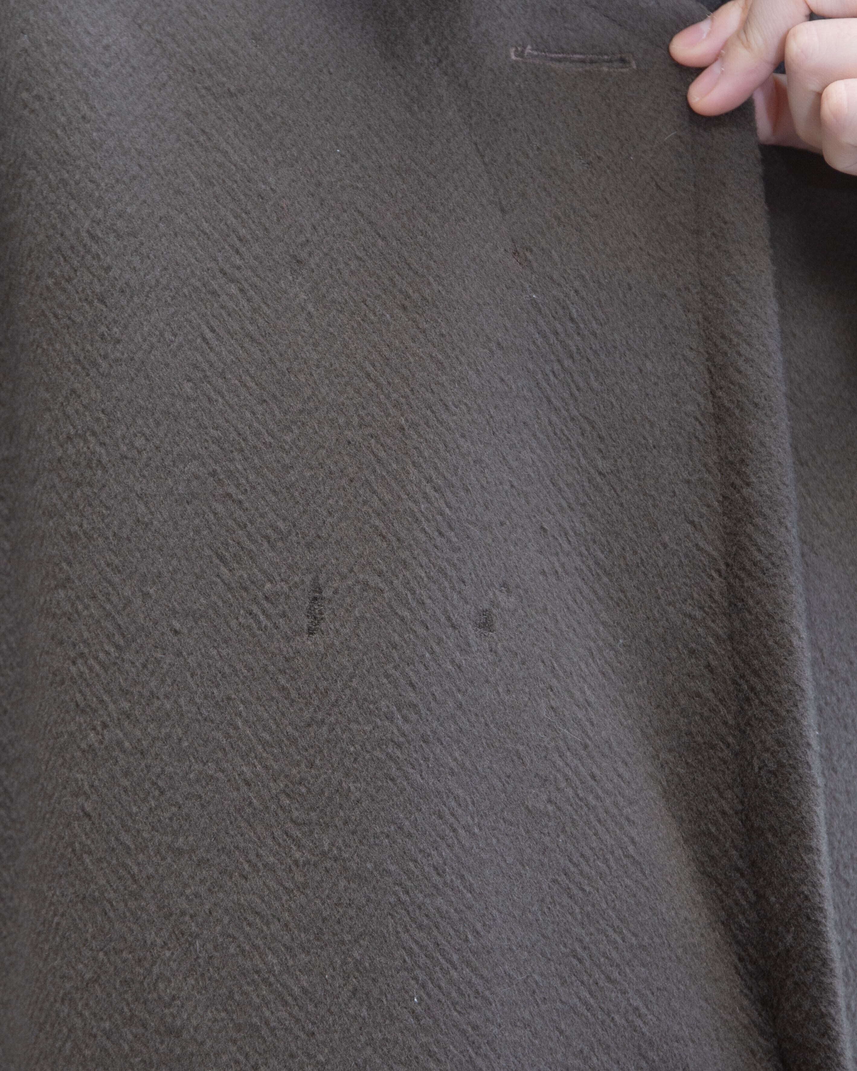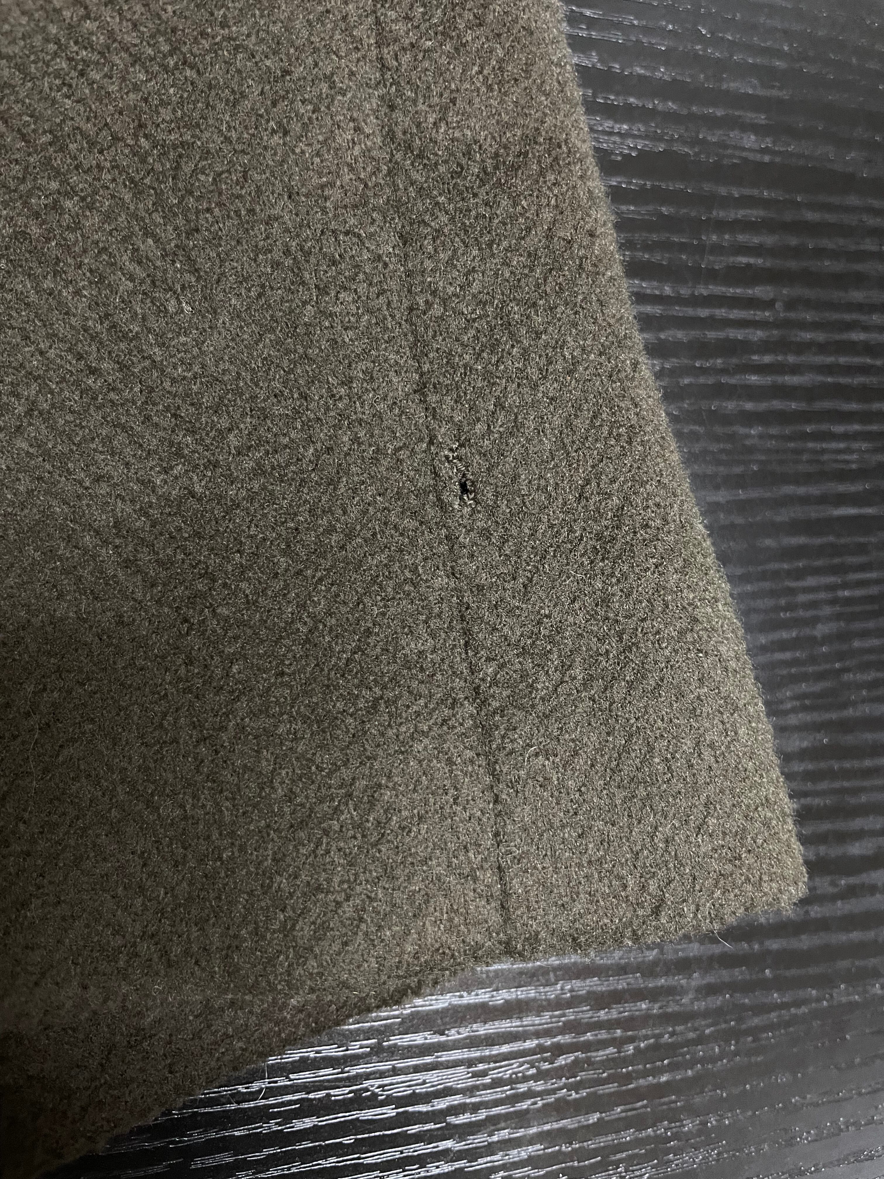 ラペル裏、襟、左身頃裾付近に小穴がございます。添付写真をご参照ください。